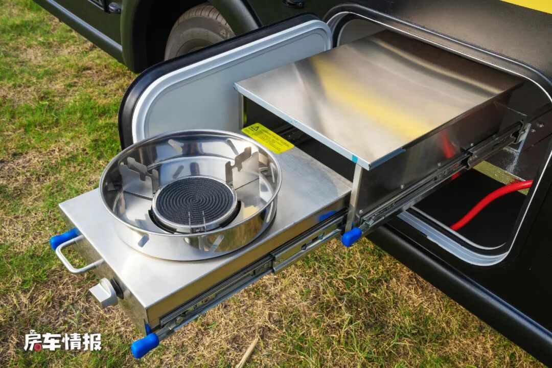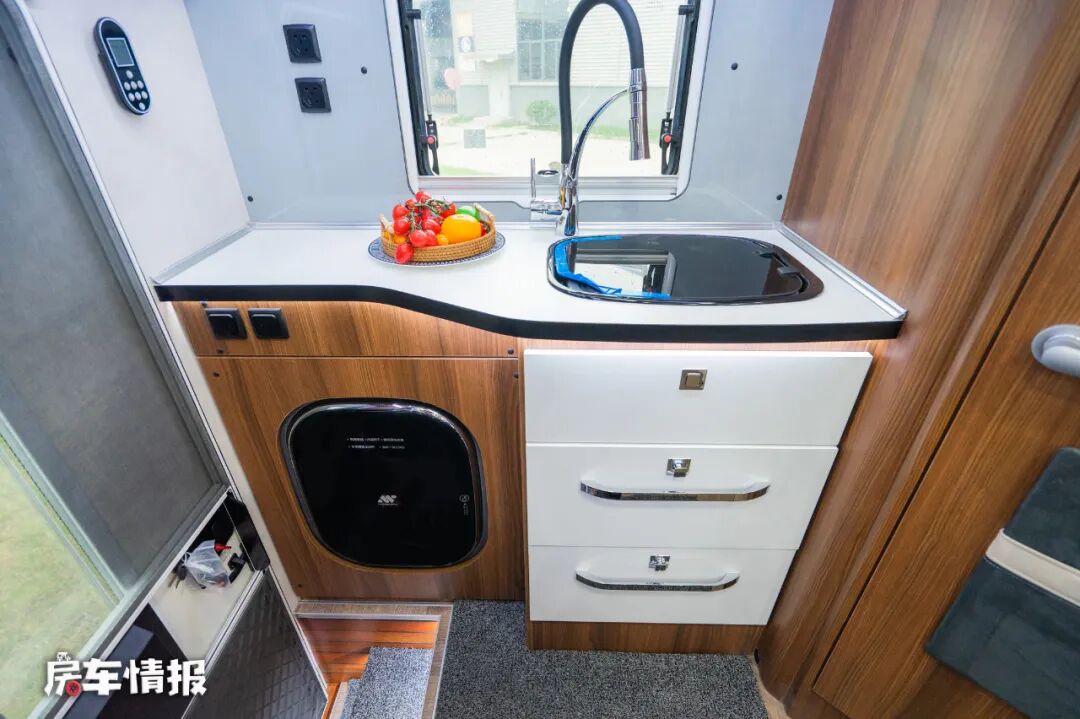 因车外带有抽拉式灶台,所以车内没有配置电磁炉,后方的操作台台面上是提供了一个翻盖的不锈钢水槽,不过侧面壁板上有电源插口,后期有需求也可以连接一些小型的厨用电器。下方则是一台3公斤的洗烘一体机,在天气潮湿的状态下,烘干功能还是非常实用的。