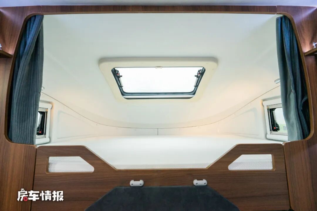 最前方驾驶室顶部,是标准的额头睡卧区,这也是全车内唯一一张固定的床铺,得益于额头的造型设计,空间表现上还是不错的,三面环窗也能带来比较不错的采光度。