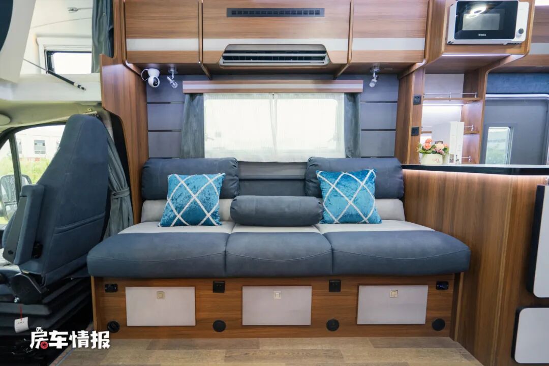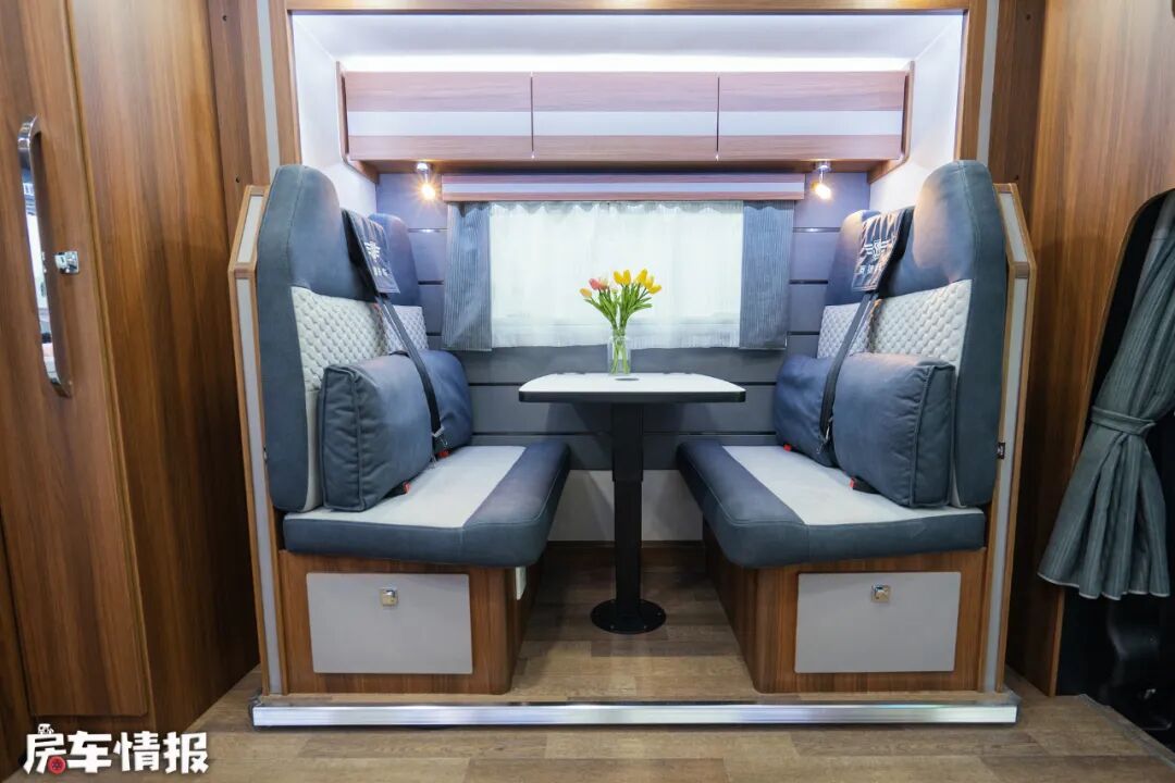 位于侧面拓展舱内的是全车主要就餐区域,依旧是采用了比较主流的四人对卡座+升降餐桌的设计,顶部和沙发下方都提供了储物空间,可以存放一些日常用品方便拿取,晚上卡座沙发和升降餐桌还能拼接成一张小型的卡坐床,能够容纳两名小朋友使用。
