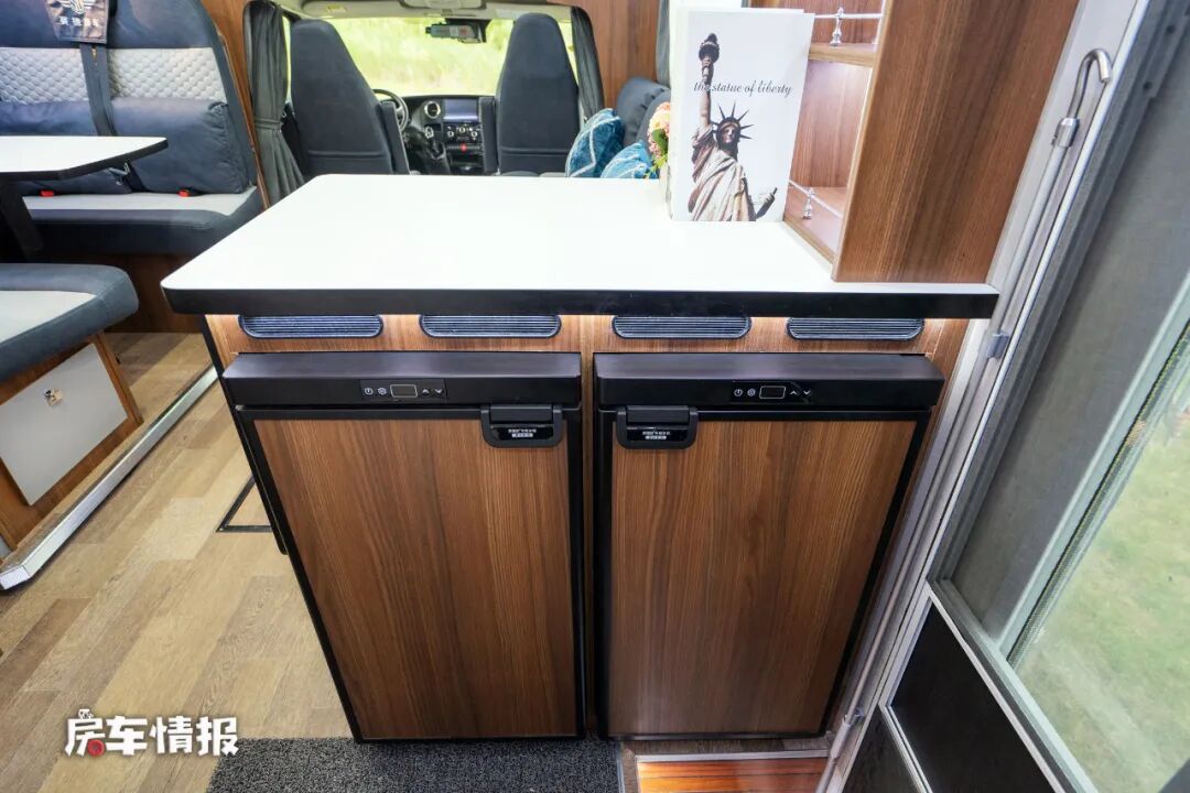 靠近乘客门的是全车的厨房区域,分置在乘客门前后,前方为一个长条的备菜桌,侧面还有拓展桌板,下方一左一右提供了两台共152升的车载冰箱,能够分类存放食材,上方则是嵌入了一台微波炉。