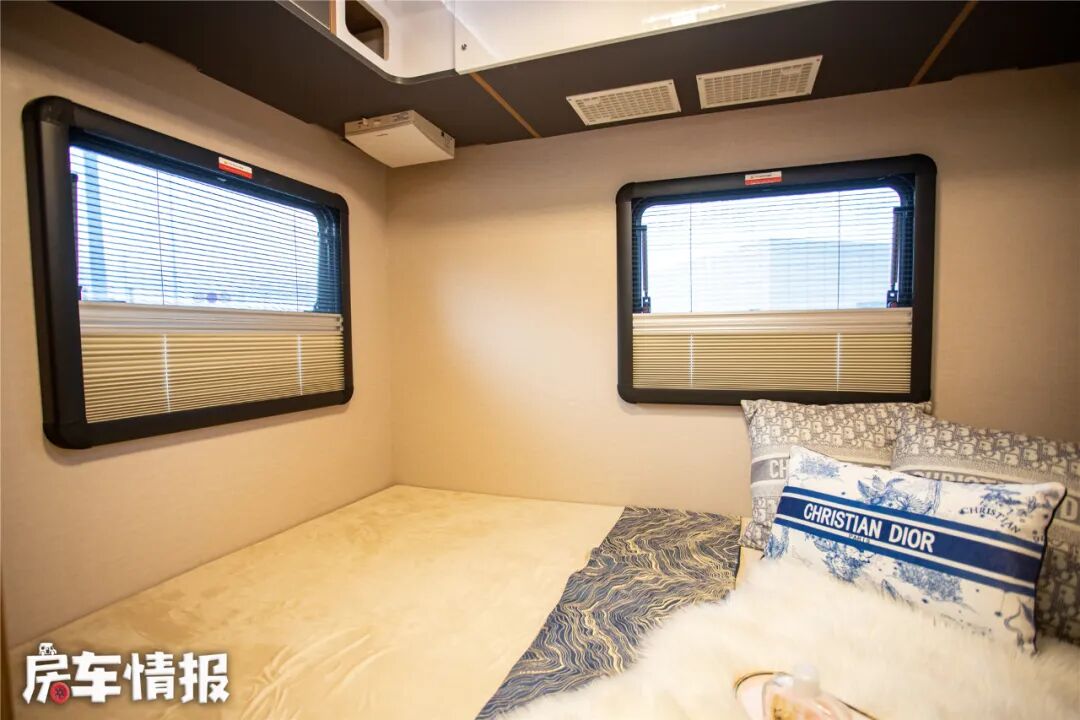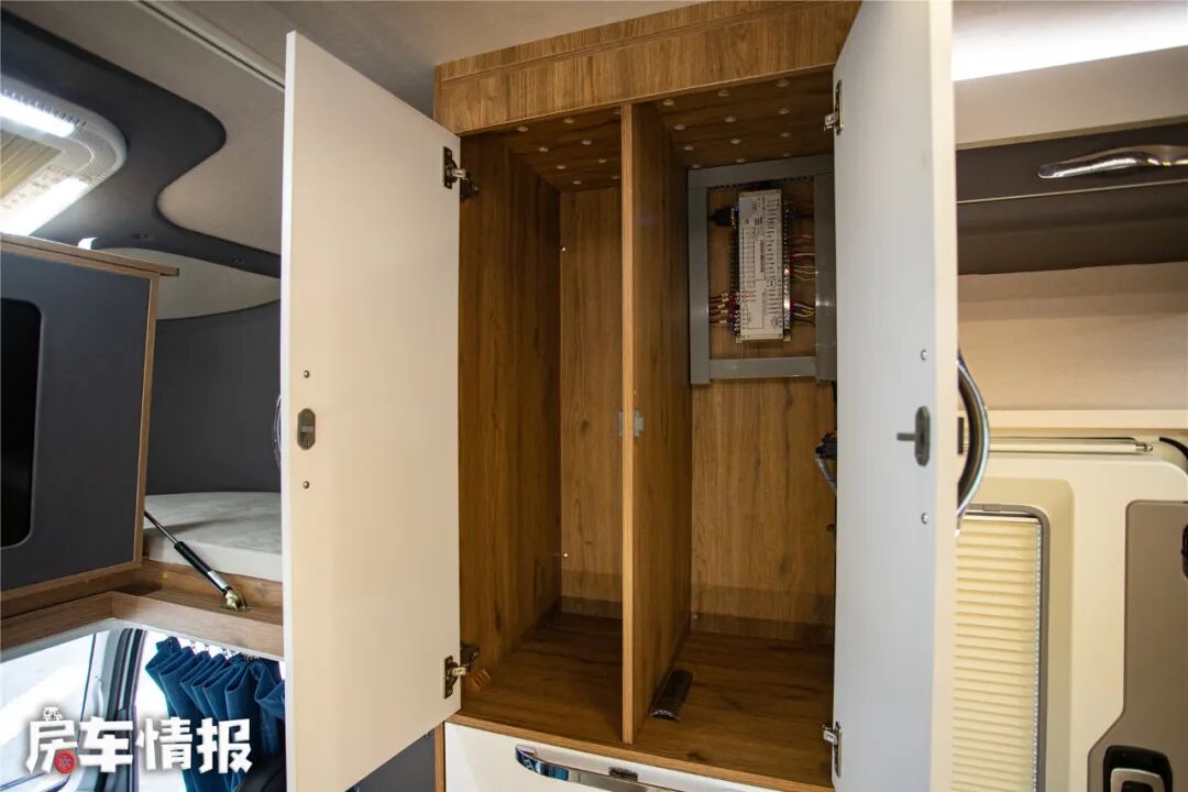 车尾部则是全车的睡卧区了,提供了一张尺寸为2100*1200毫米的横置双人床,睡下两名成年人问题不大,床尾处还有一个空间不错的衣柜,可以放置一些换洗的衣物或者被褥,整辆车的储物能力还是非常不错的。