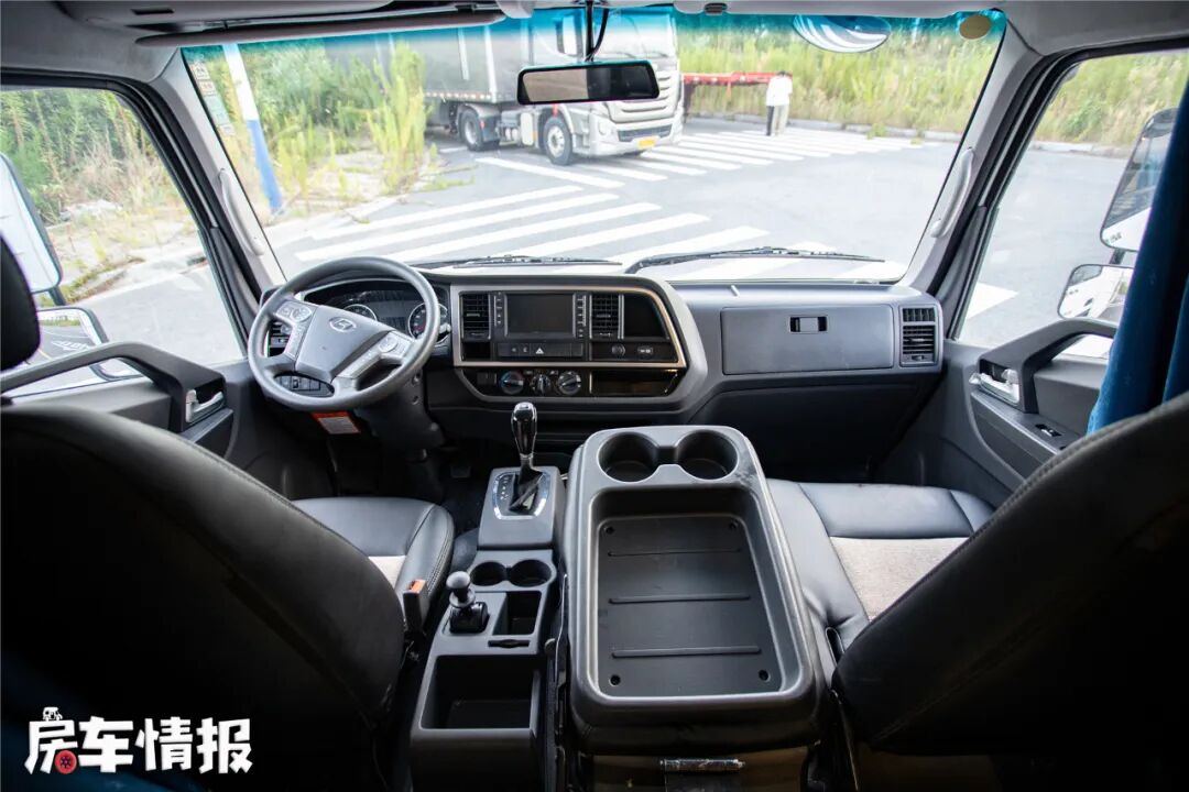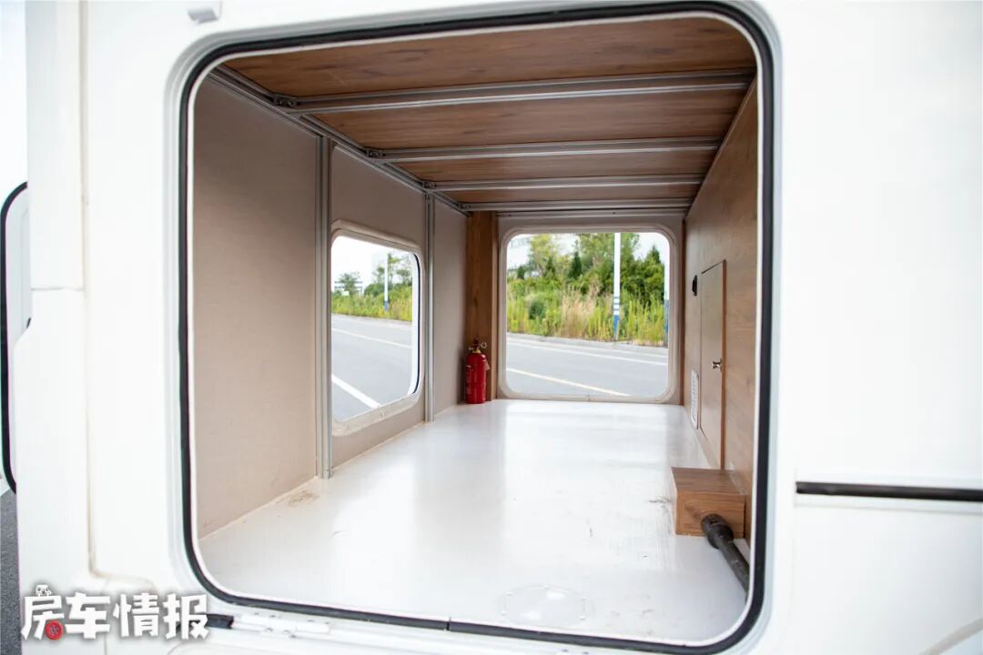 整车采用了双层地板的设计,所以后方的生活区较前方驾驶室来说更高一些,双层地板中间则容纳了全车的水电路系统,通过燃油暖风给夹层供暖可以保证在冬天的时候正常的使用水路系统,最关键是这样的设计更加的安全可靠。
