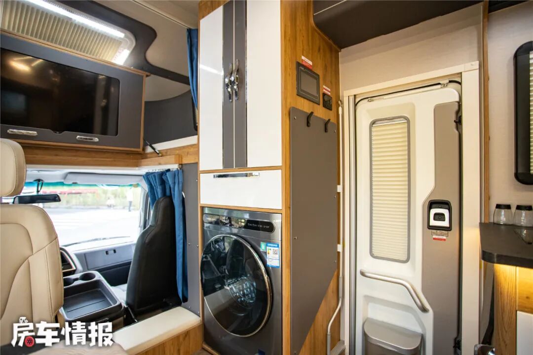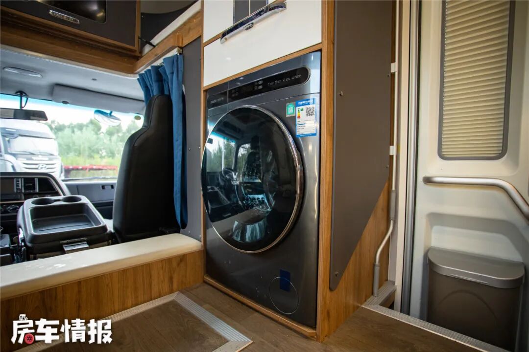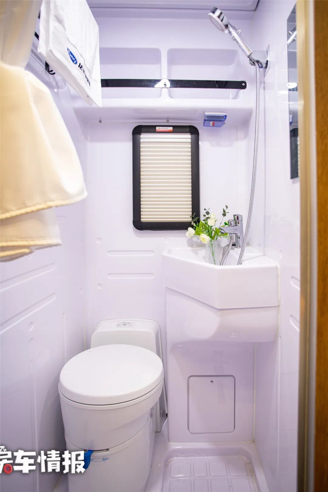 得益于底盘的尺寸,车内的卫浴室空间还是不错的,内部提供了可旋转的盒式马桶、独立的淋浴花洒、洗手台盆、换气扇等。