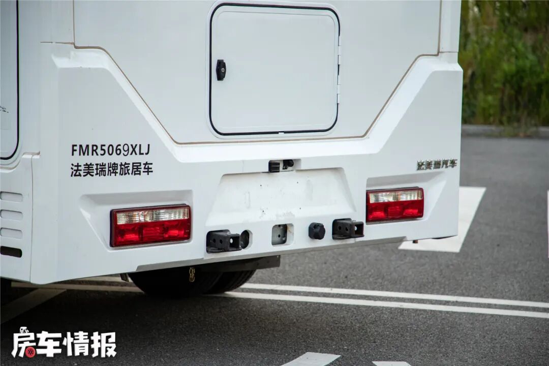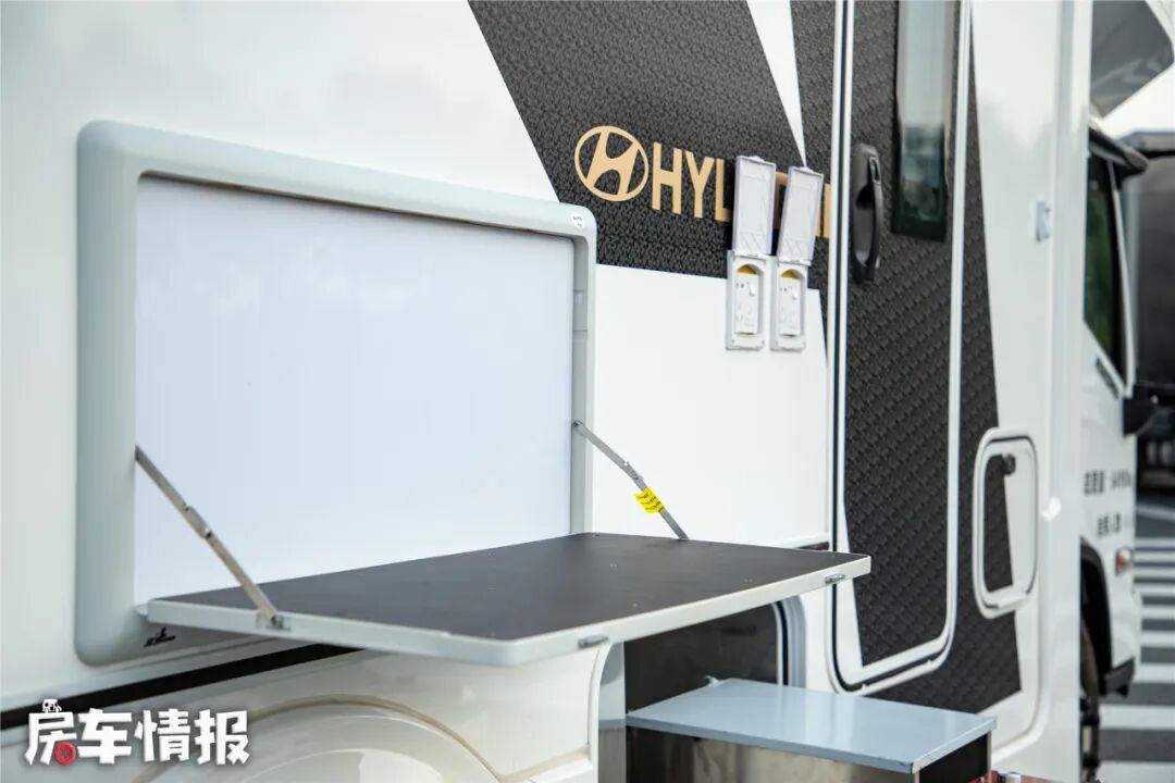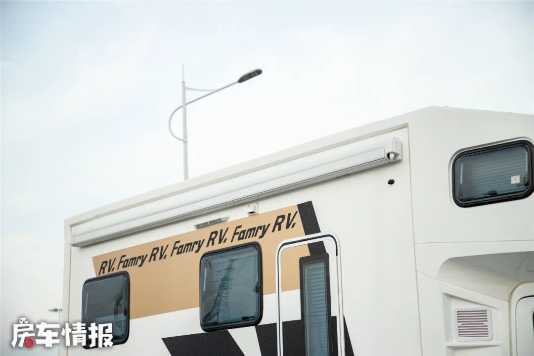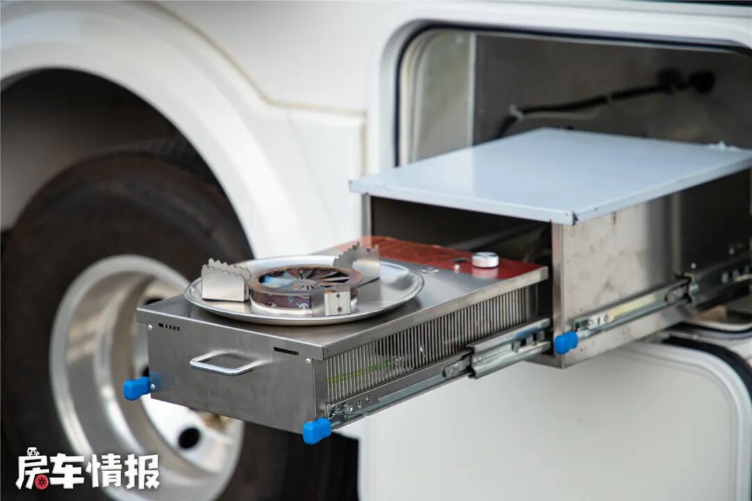 这款车在车身外部配置了比较丰富的生活配件,包括手动的遮阳棚、外置抽拉柴油灶、外置翻板,以及一个三开口的贯通式储物箱,其容积可达2000升,足以存放一些大型的行李箱,另外在车尾部还预留了拖车方口和摩托车架安装口,整辆车还带有3.5吨的牵引资质。