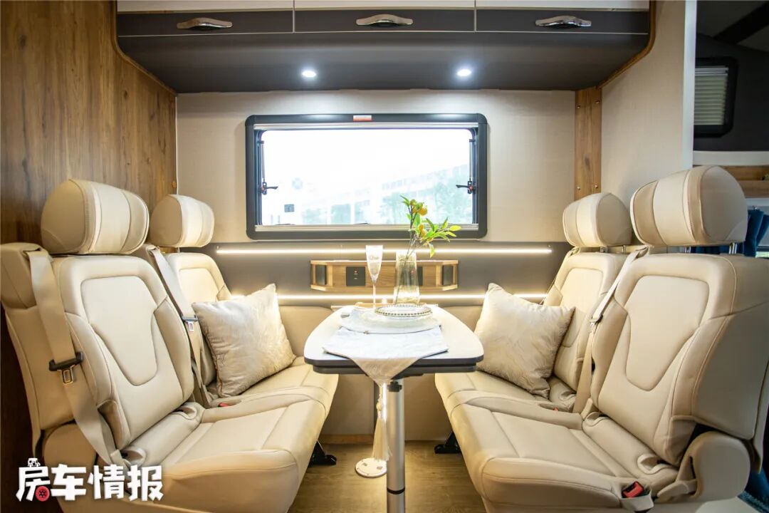位于主驾驶座椅后方的是全车的会客区,采用四人对卡座沙发+升降餐桌的设计,座椅全部是乘用车级别的座椅,填充饱满而且是皮质包覆的,并且带有头枕,可以为日常的乘坐带来不错的舒适度。