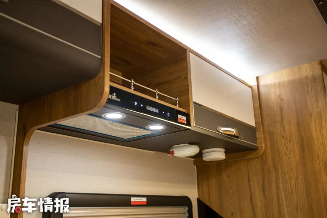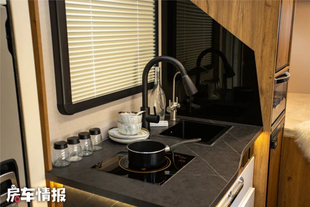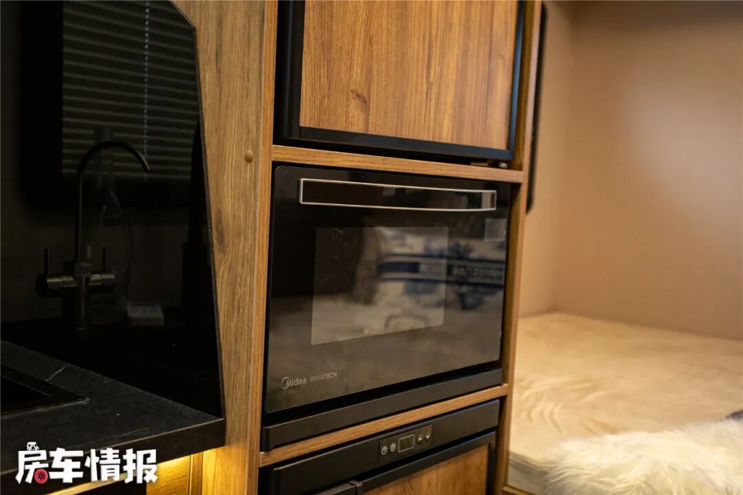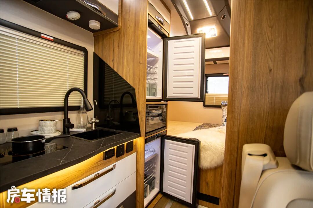 位于乘客门后方的厨房操作台的空间并不是很大,侧面有一个三角形的备菜小桌板,台面上则提供了电磁炉和水槽,顶部提供了抽油烟机,后方则是双开门的冰箱以及一台微波炉,能够满足日常的烹饪需求。