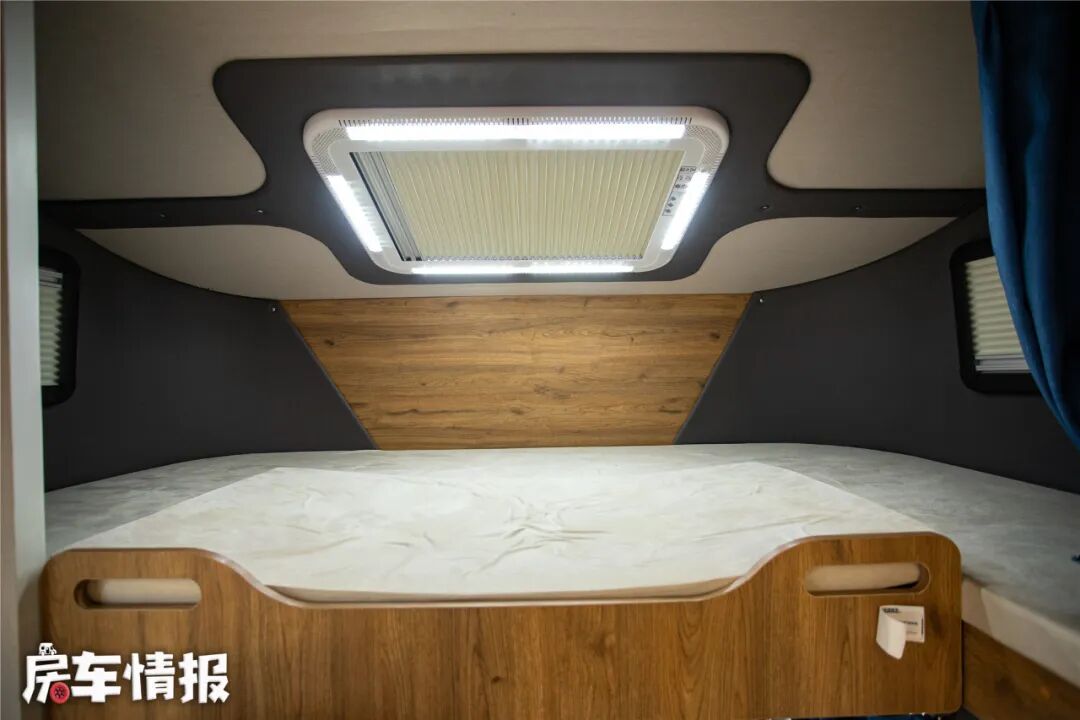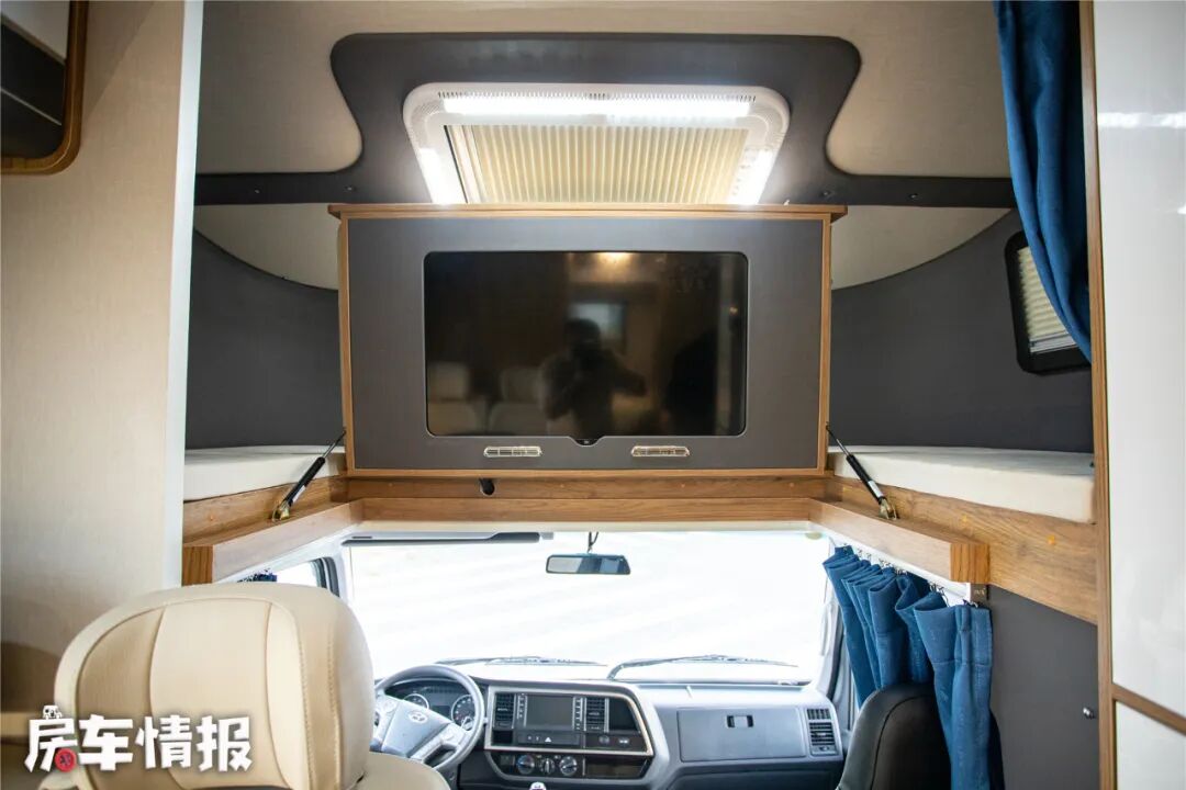 除此之外,在最前方驾驶室的顶部还包含了一张标准的额头床,尺寸为2100*1500毫米,能够容纳两名成年人使用,床板下方则是提供了一台液晶电视。