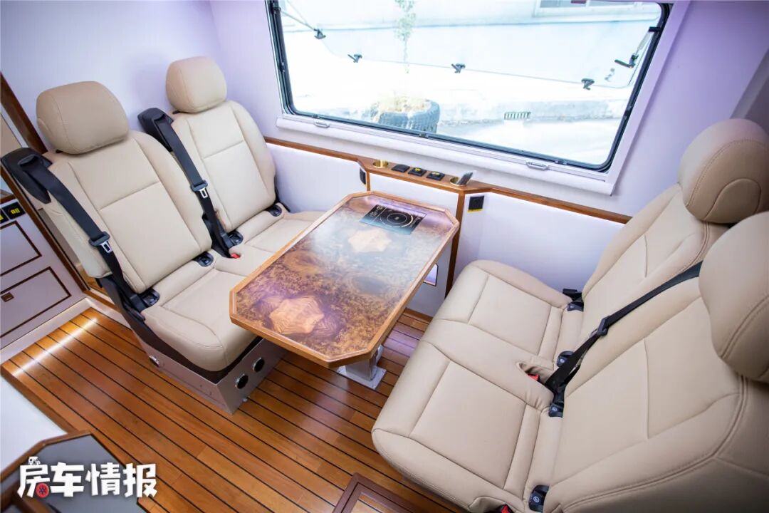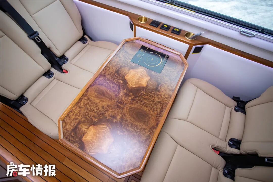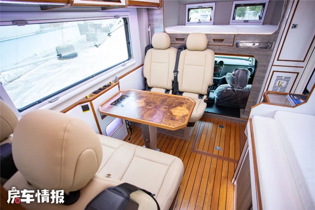 车身内部的空间还是挺出乎意料的,加上大量的白色家具和氛围灯,整体给人的感觉非常的明亮通透,不过整体的装修风格更有点中式风的样子,下方是采用了游艇用柚木地板,看起来更有质感。