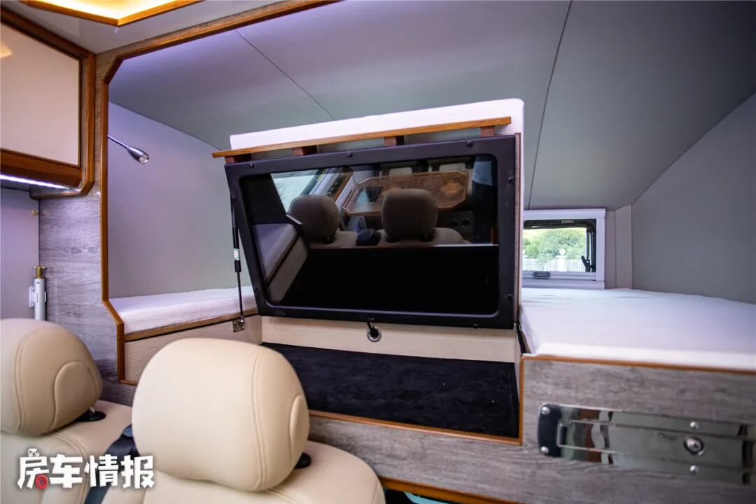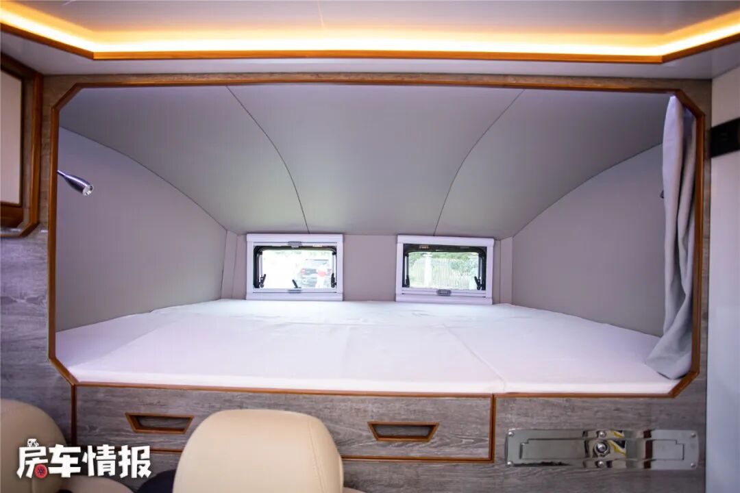 在最前方驾驶室顶部,是标准的额头休息区,得益于外观的造型设计,整体的空间还是很不错的,最前方还有两个可以通风换气的窗户,床铺尺寸为1900*1300毫米,可以容纳两个成年人使用,床板下方还提供了一台带触摸功能的液晶电视。