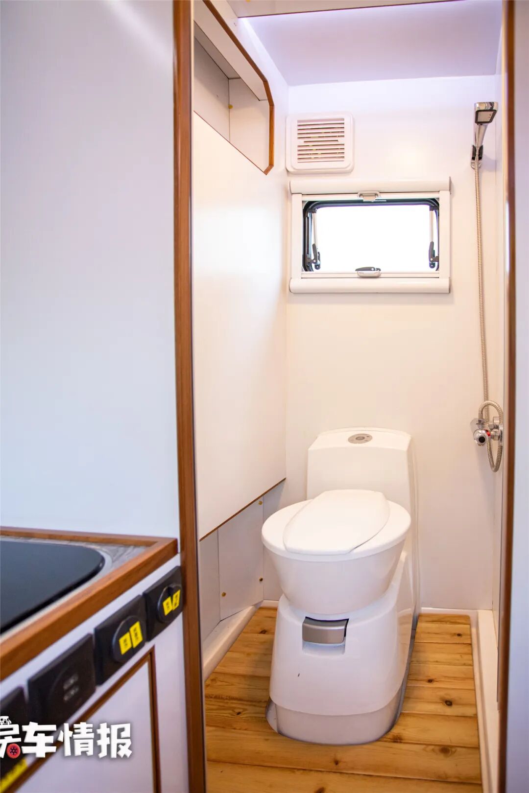 会客区后方是全车的独立卫浴室,内部和外部采用了一样的装饰风格,使其看起来更加的协调统一,配有马桶、自动恒温的淋浴花洒,可以满足日常基础的洗漱需求。