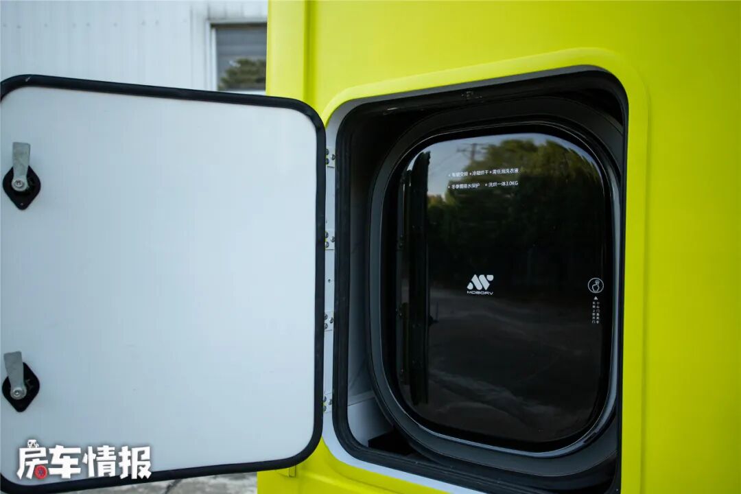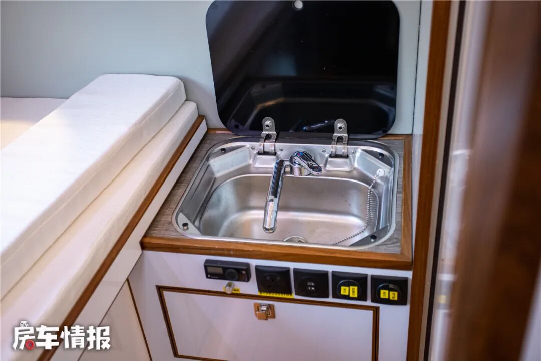 车身外部配置了手动的遮阳棚、工具箱、外挂洗衣机、外置抽拉燃油灶、外置备胎和水电接驳口等,最特别是车尾后方的备胎是以嵌入式的形式悬挂的,还是能够看出来是动了心思的小设计。