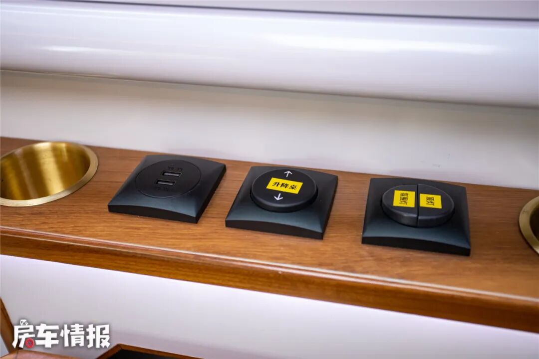 而中间的餐桌设计的还是挺有意思的,在最内侧是提供了一个小型的电磁炉,旁边窗台上还有电源插和杯托,这样驻车的时候,也能够在这里烧水沏茶,享受惬意的生活。