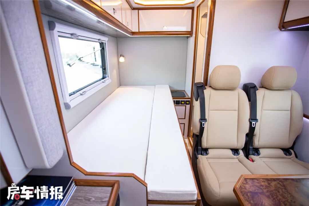 乘客门后方则是全车的固定床铺,整体采用纵置床的设计,侧面有拓展功能,打开之后床铺的尺寸可以达到1920*750毫米,躺下一个成年人还是没有问题的。