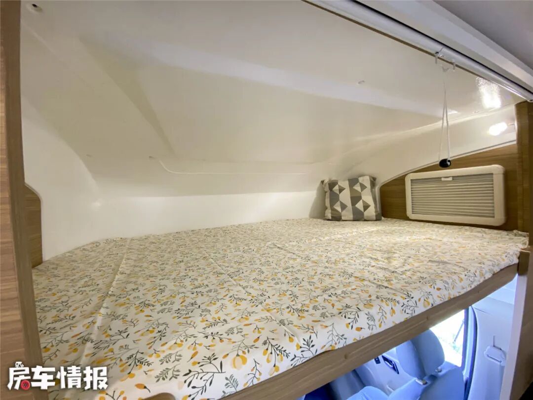 在最前方的驾驶室顶部,是一张尺寸为2250*2450毫米的双人额头床,两侧带有采光通风的窗户,后期也可以增加顶部的天窗,以提升整体的光亮度。