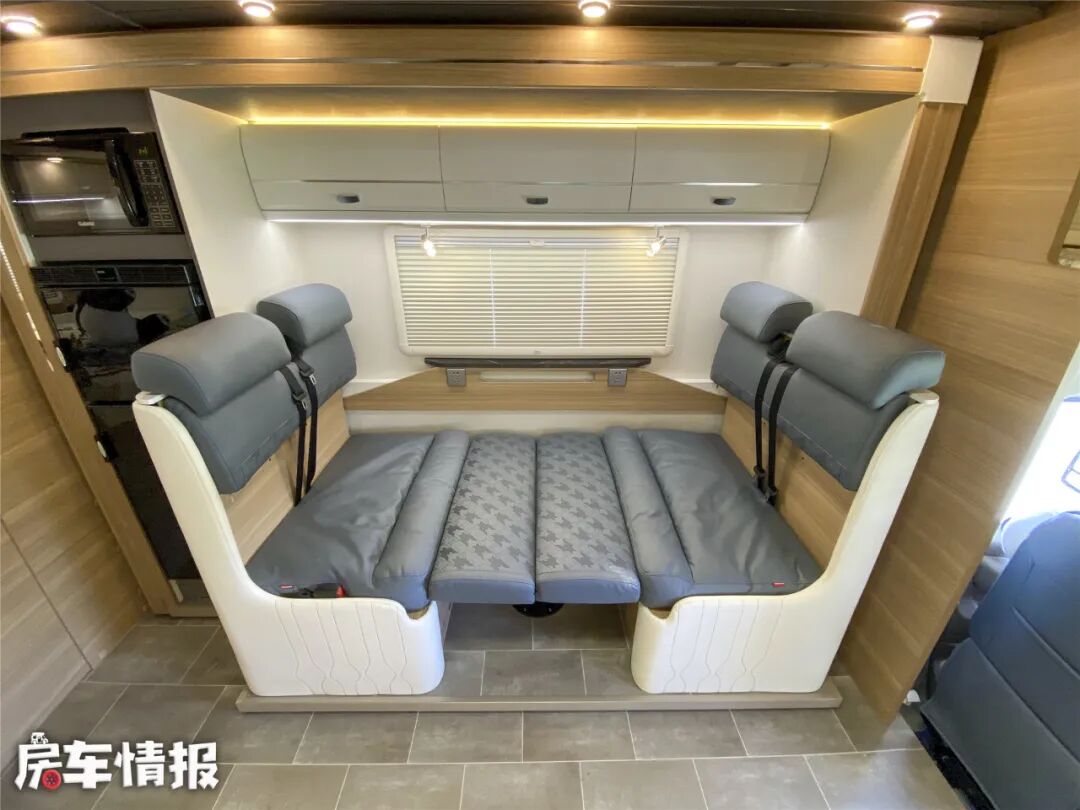 位于侧拓展中的是全车的会客区域,采用了经典的四人对卡座沙发+升降餐桌的设计,日常行车可以满足四个人的乘坐需求,晚上的时候则可以变成一张尺寸为1800*1000毫米的单人沙发床,无论是睡一个成年人,还是两个小朋友,整体空间都是能够满足的。