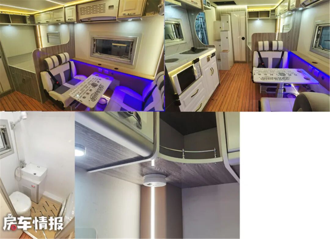 关于车内的设计,就要常规一些了,明亮的配色和车外相得益彰,不过要是能够再科幻一点,个人觉得会更符合外部的气质,布局上采用了常规的布局方式,提供了额头床、四人对卡座、独立卫生间以及厨房区域等,比较适合2-3口人出行。