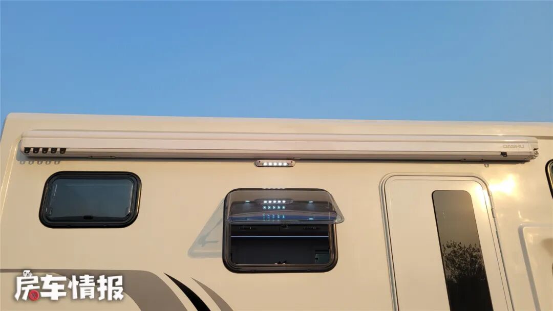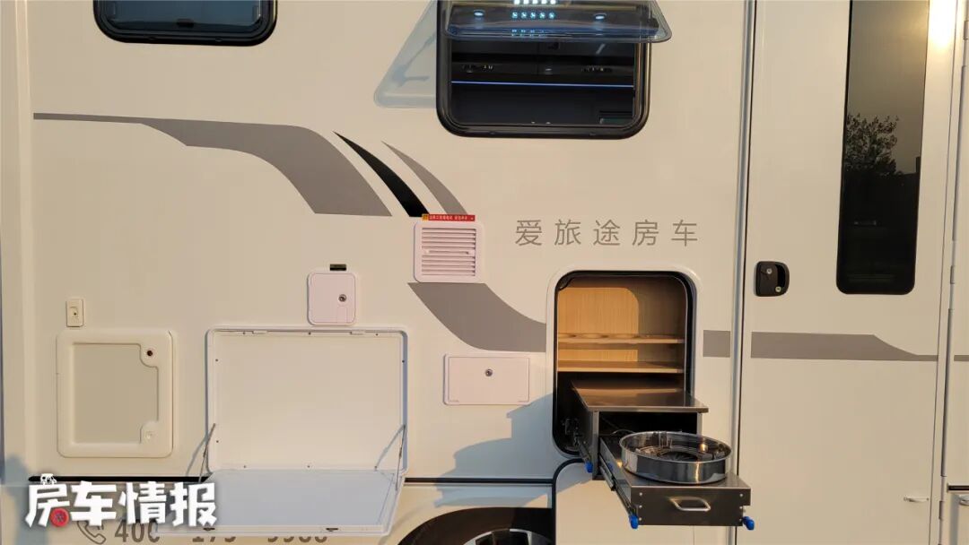 车身外部也提供了比较丰富的户外设备,包括手动遮阳棚、户外抽拉灶台、外置翻板、户外淋浴花洒、水电接驳口等,能够满足日常的出行需求。