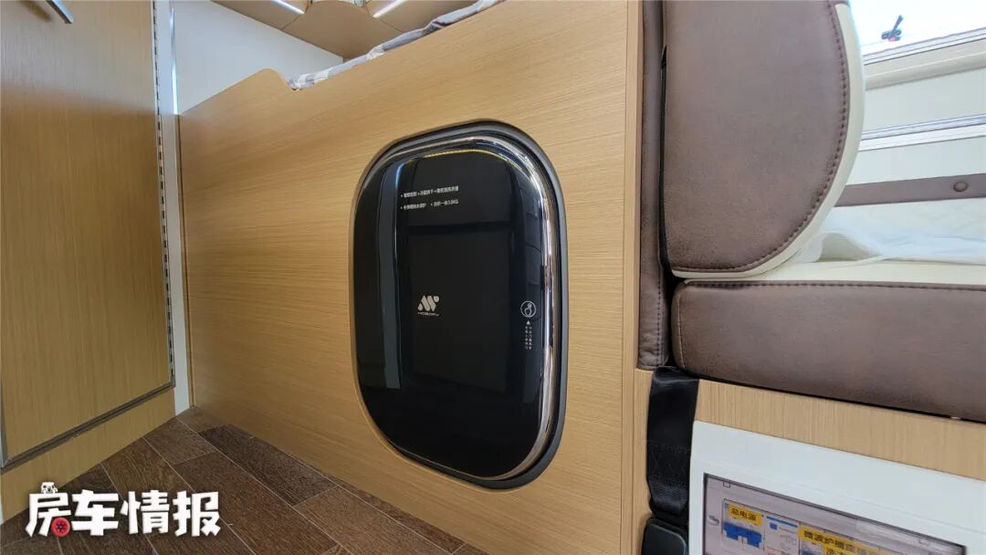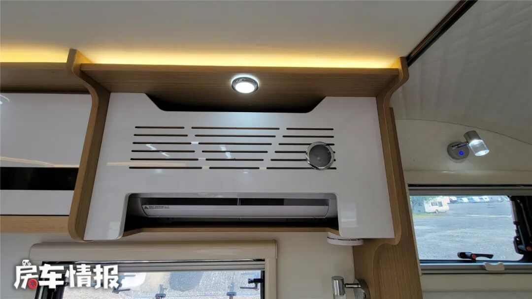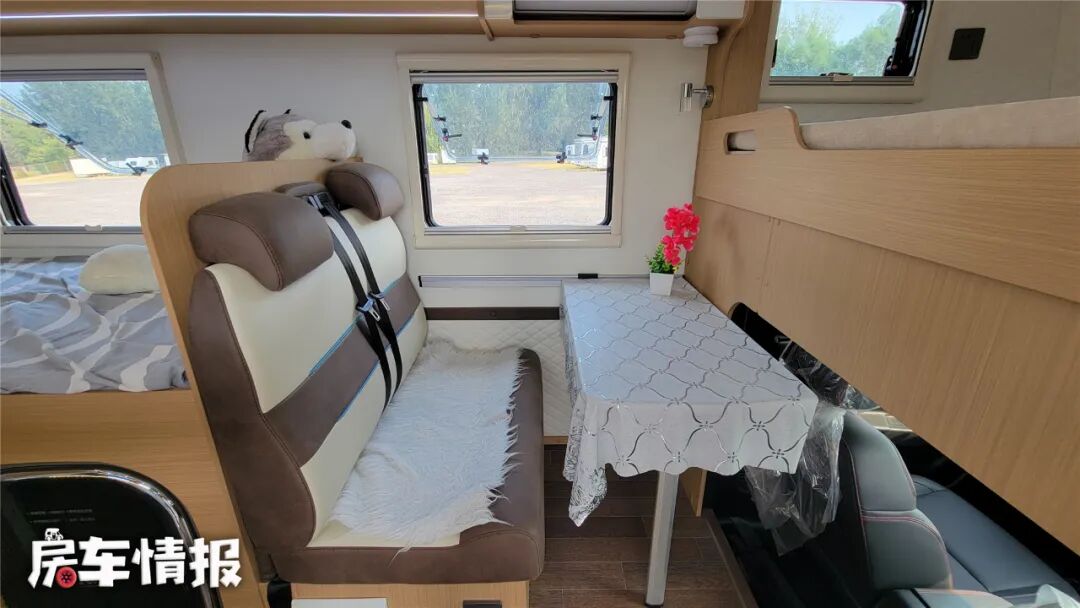 车内的会客就餐区域采用了双人联排座椅+餐桌设计,虽然尺寸不如大型房车的宽敞,但是基础的就餐工作等一些需求还是能够满足的,顶部还配备有一台家用变频空调,能够为车内打造一个相对舒适的居住环境。