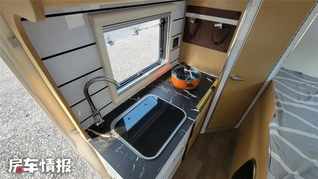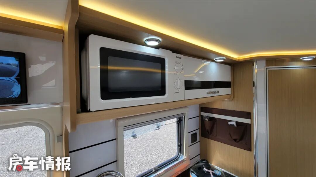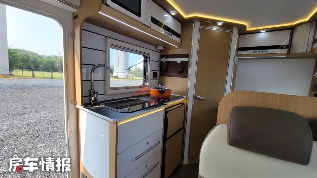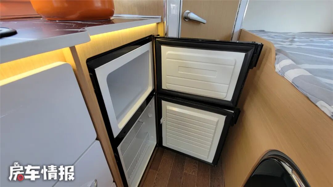 乘客门后方是全车的厨卫区域,前方是厨房操作台,台面上提供了翻盖的不锈钢水槽和电磁炉,上方提供了微波炉,下方则是一台85升的双开门冰箱,能够满足日常分类存放食材的需求,一些基础的烹饪也可以满足。