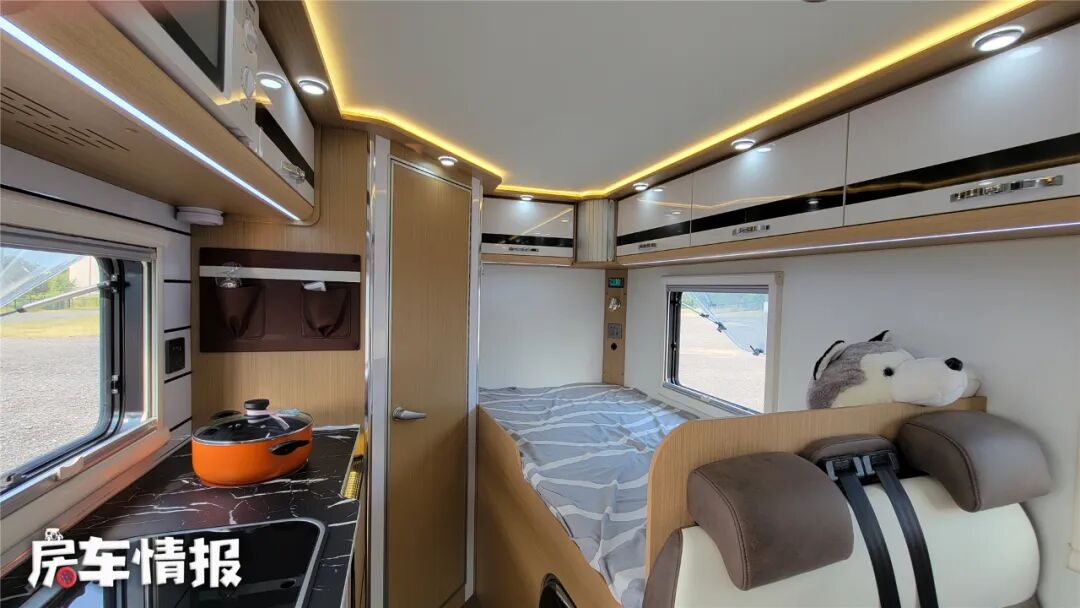 车内的布局是采用了C型房车内部比较常用的设计,虽然皮卡车型尺寸有限,但是根据合理的布局和设计也能带来较为舒适的空间,加上顶部氛围灯,整个车内散发着温馨居家的气氛。