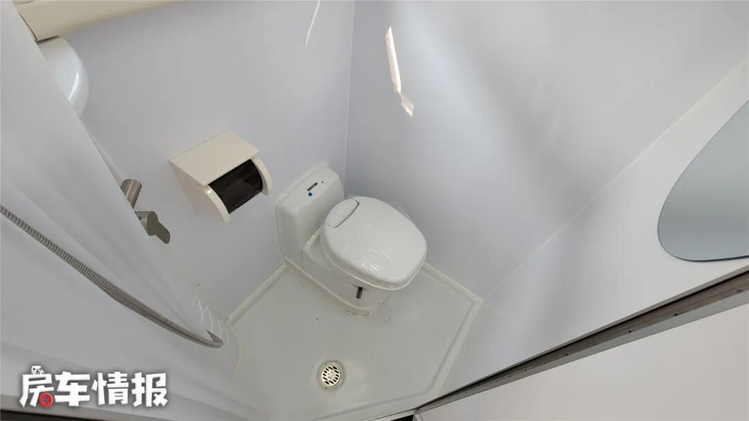 后面的独立卫浴室设计的就相对简单了,带有可旋转的盒式马桶、独立的淋浴花洒,能够满足基础的洗漱如厕需求。