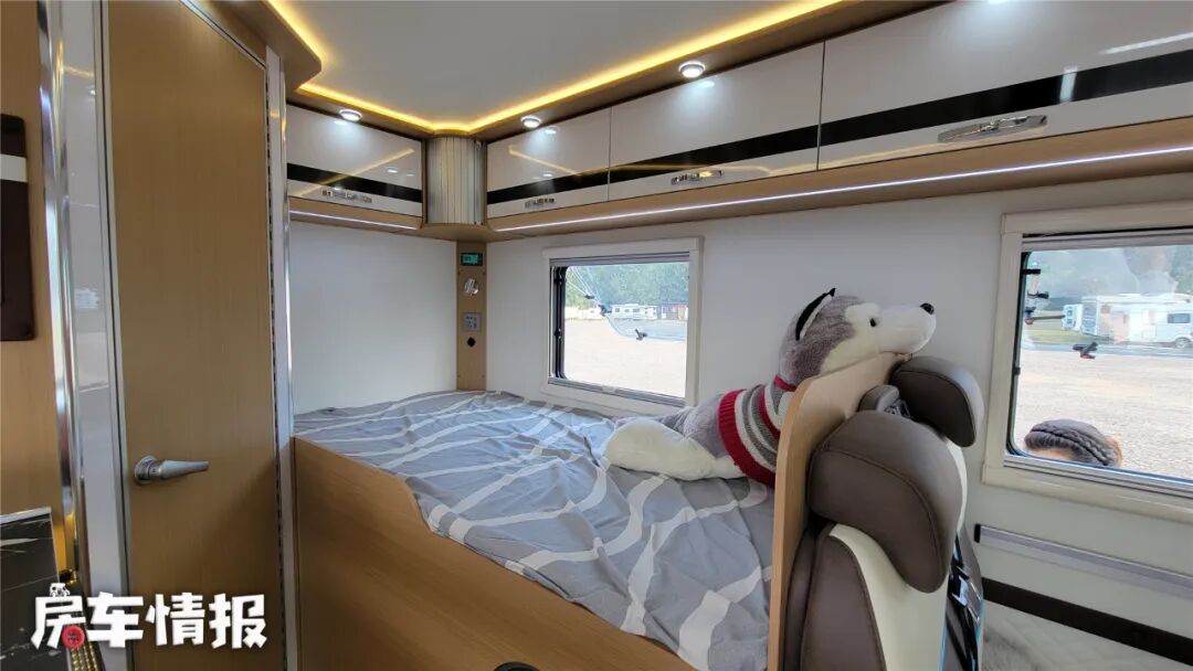 最后就是位于车厢尾部的睡卧区了,采用的是纵置床的设计,尺寸为1800*1100毫米,也能够满足日常的睡觉休息需求。