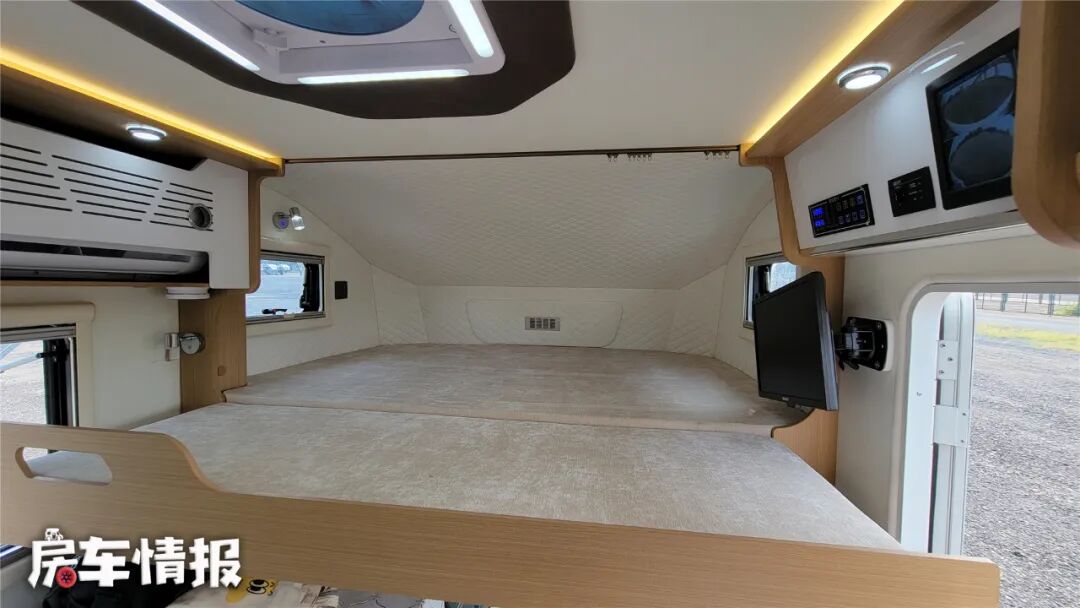 最前方驾驶室顶部是一张带有抽拉拓展区域的额头双人床,打开后的整体的尺寸为1850*1800毫米,能够容纳2-3个成年人使用,相对固定的额头床来说,这个尺寸还是表现的非常不错的,另外两侧也有通风换气的采光窗户。