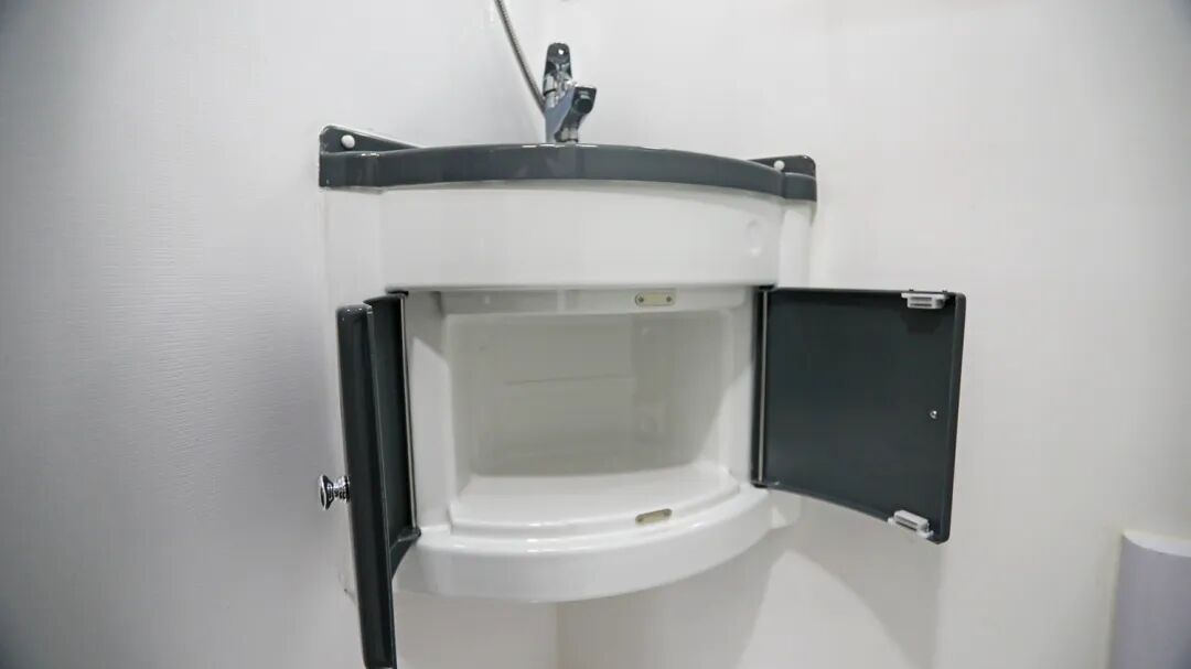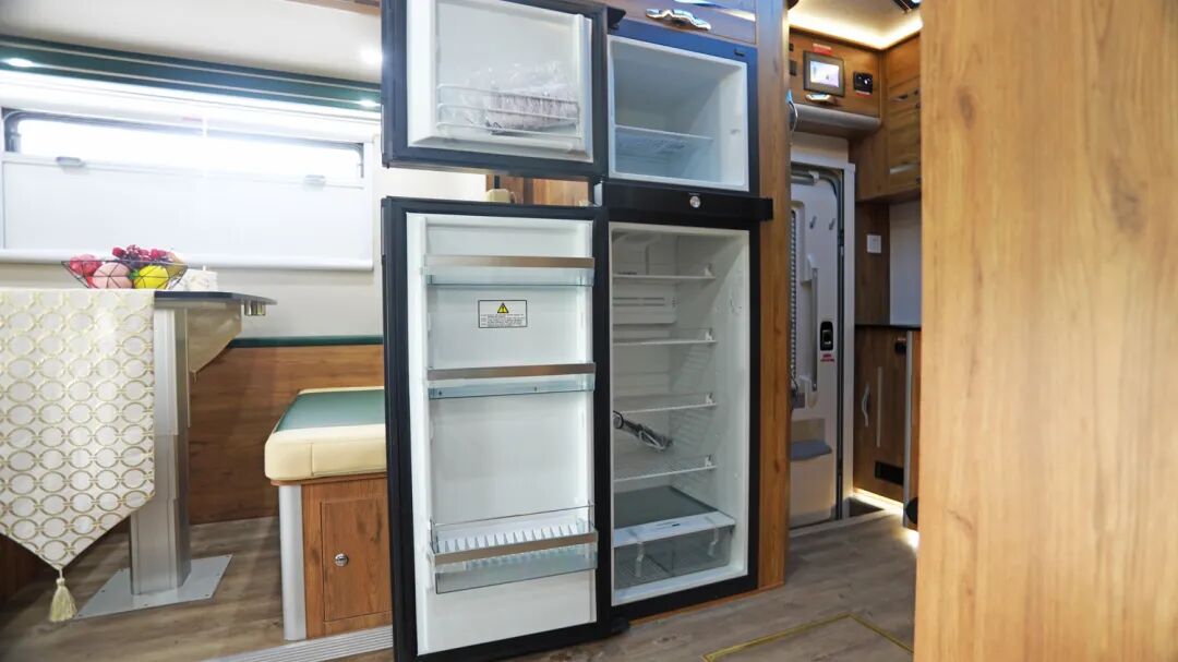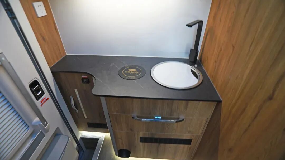 厨房区黑色操作台镶嵌电磁炉和洗菜池,台面周围配备油烟机、置物柜、行车空调冷风出风口。双层抽屉+储物柜的设计,使得厨房的瓶瓶罐罐可以随意存放。进口224L多美达冰箱拥有超大容量,可满足旅行途中各种食材的储藏。同时,厨房区还安置了进口埃贝赫4000w加热器开关,还有为了用车安全装配的一氧化碳报警器和烟雾报警器。