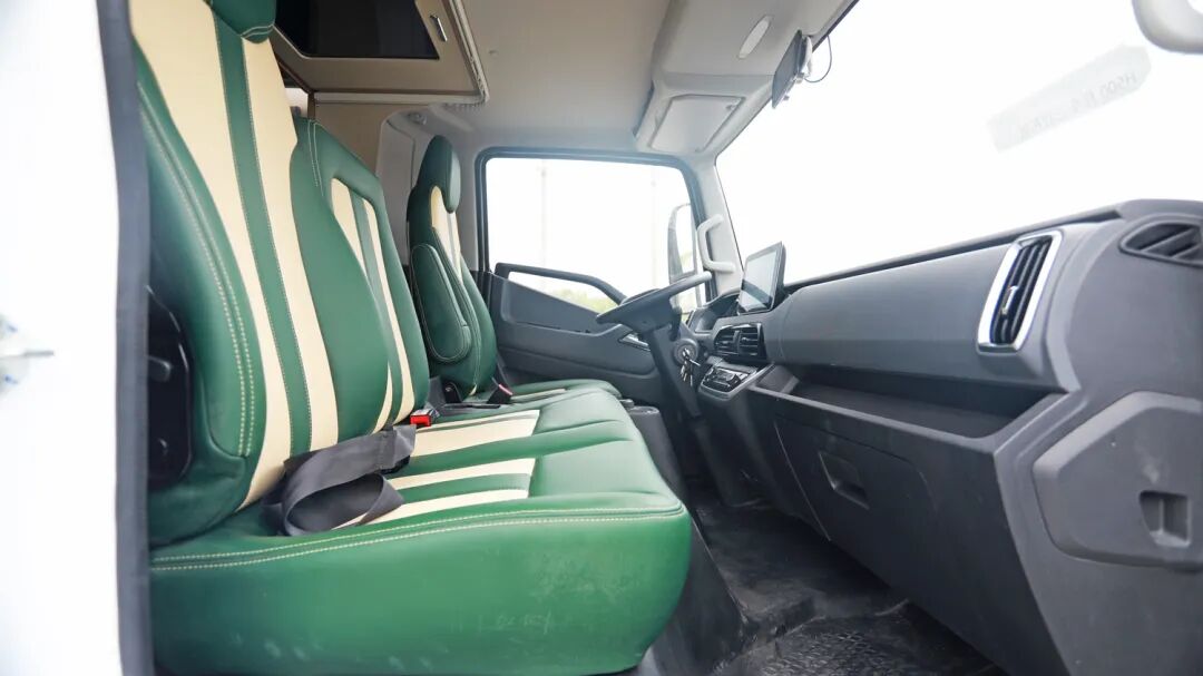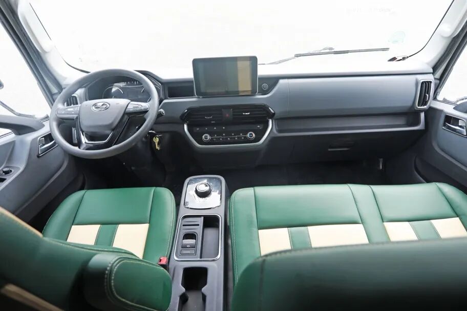 四向调节座椅墨绿皮质与车内格调一致,多功能方向盘,具备定速巡航、排气制动功能,安装了360度全景远程监控,功能十分齐全。