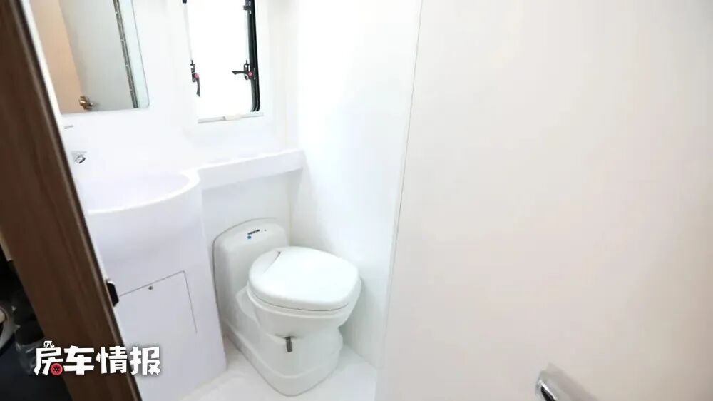 操作台后方是全车的独立卫浴室,采用一体吸塑式的设计,能够有效的防潮防水延长使用寿命,内部提供了可旋转的盒式马桶、洗手台盆、独立花洒、梳妆镜、换气扇等洗浴设备。