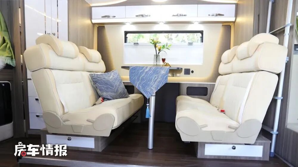 会客区位于全车的侧拓展内,采用四张乘用车座椅+餐桌的设计,座椅带有头枕和安全带,并且能够调节角度,可以为日常乘坐提供良好的舒适性,顶部还提供了基础的吊柜,已满如日常物品的存放需求,另外晚上的时候还能够拼接成一张尺寸为 2000*1000毫米的单人卡座床使用。