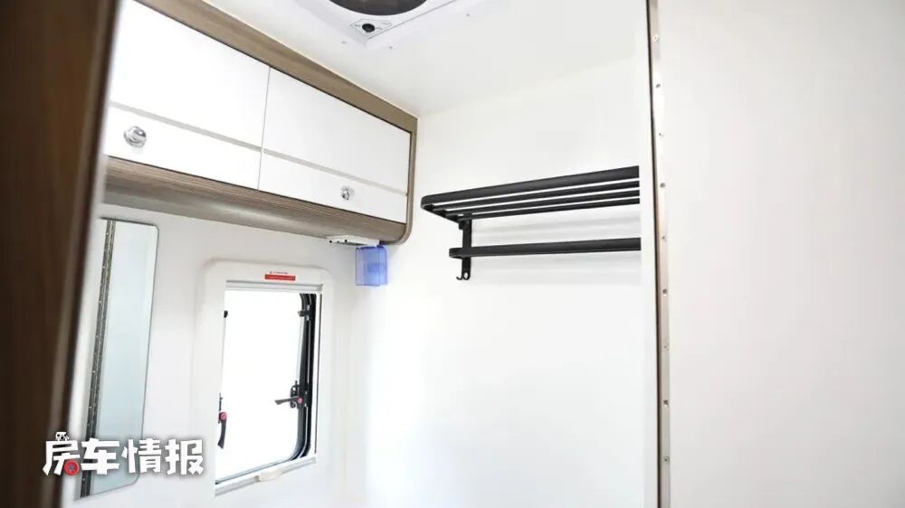 最后就是位于车厢尾部的横置双人床了,平时可以满足两个成年人的住宿需求,另外顶部除了提供基础的吊柜,还配有一台家用变频空调,能够根据自身需求调节车内温度。