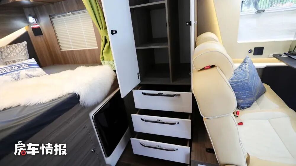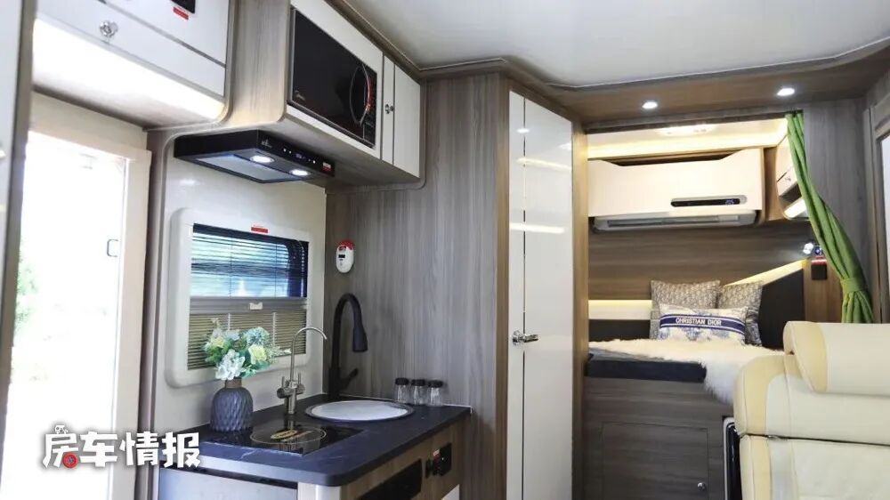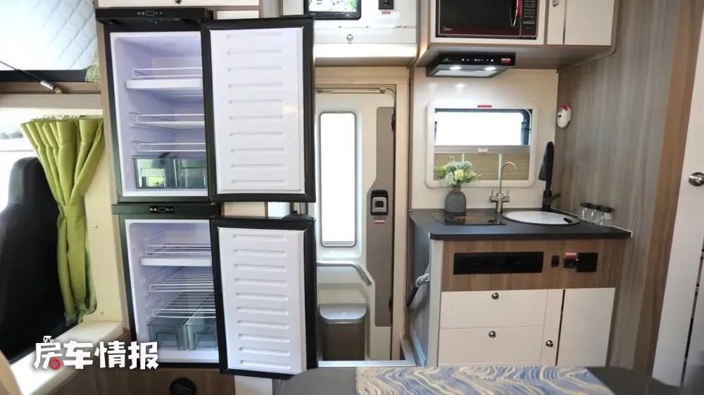 厨房区则分布于乘客门的前后,前方是一台152升的大容量双开门冰箱,可以满足日常分类存放食材的需求,后方则是全车的主要厨房操作台,台面上提供了电磁炉和不锈钢水槽,并带有直饮水的功能,上方配有抽油烟机和微波炉,能够解决日常的烹饪需求。