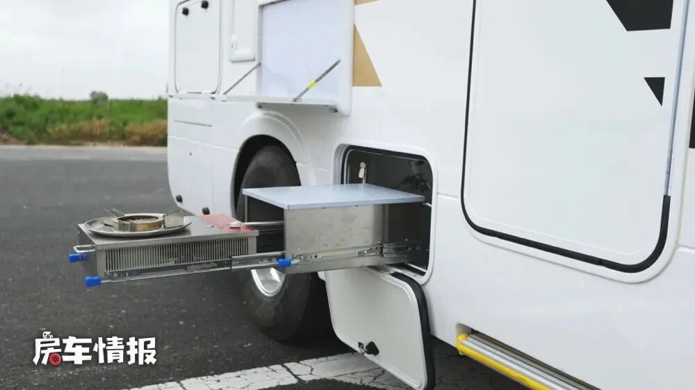 车身外部的配置也是相当丰富的,包括4米的遮阳棚、电动踏步、户外淋浴、外置抽拉柴油灶、外置餐板以及贯通式储物舱等,为后期使用带来了更便携的操作。