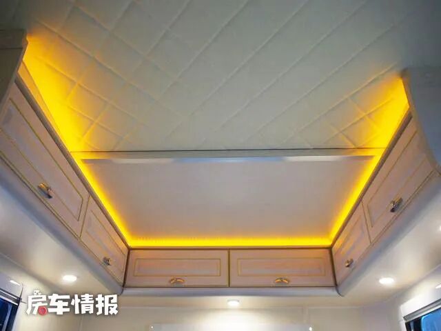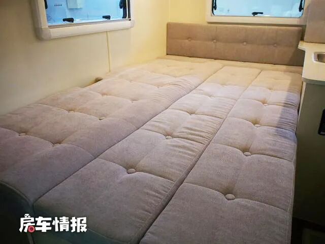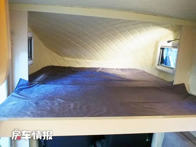 除去沙发床之外,在前方驾驶室上方的额头区域内提供了一张额头双人床,同时外侧还有拓展区域,尺寸可以达到1740mm*1300mm,大小完全可以容纳两个成年人睡觉休息使用,而且额头区采用了软包工艺,防止平时磕碰。两侧还带有外推窗,既保证了采光量,也可以通风换气。
