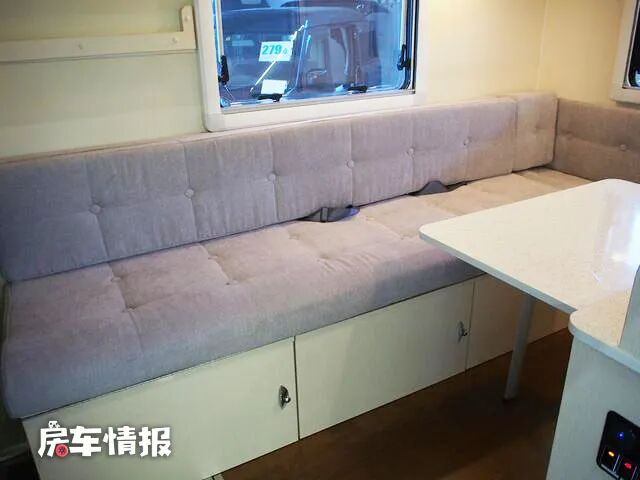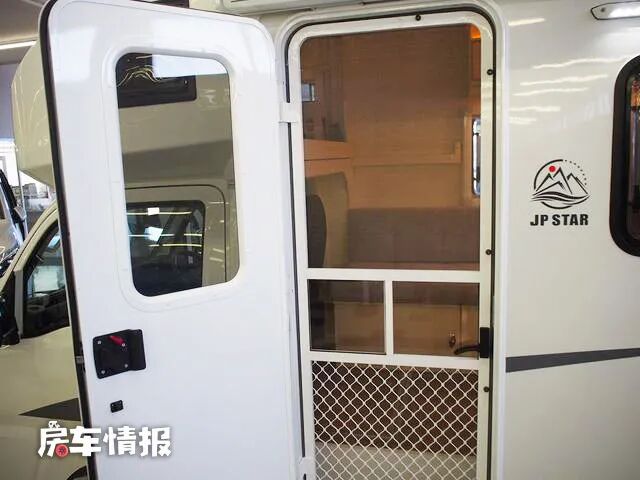 从车身的左前侧进入车厢,乘客门带有防蚊网,车厢内部相比于我们国家的房车来说,内部的空间就显得有些狭小了,分区也不是很明显。