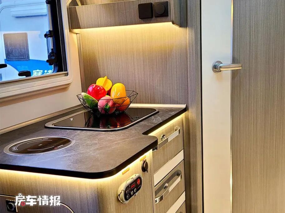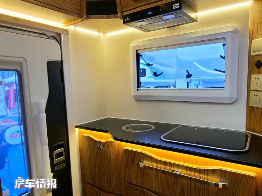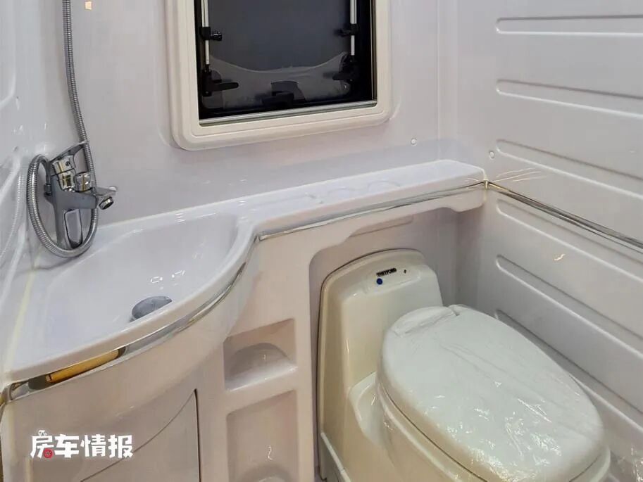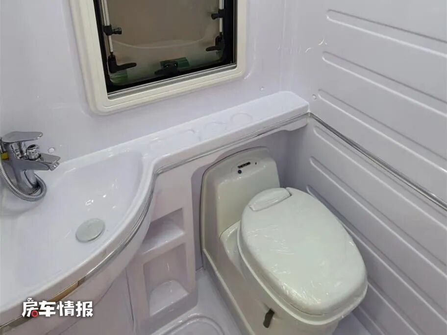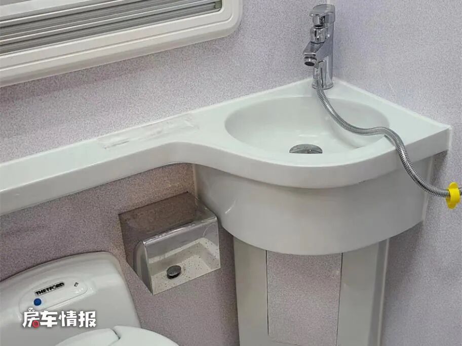 厨房区配备了电磁炉、抽油烟机、洗菜盆、148L冰箱和微波炉,卫浴室则提供了马桶、淋浴花洒、梳妆镜和换气扇等基础淋浴设施,同时全车还配备了洗衣机和32寸的车载智能电视。