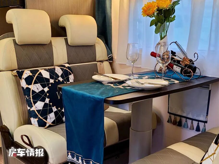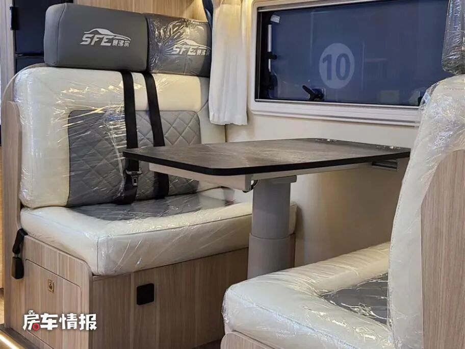 车厢前部不仅提供了四人对卡座的会客区,还提供了一排长条沙发,平时晚上睡觉的时候就可以拓展成沙发床使用,因此这款房车也就摒弃了固定床的设计,将厨房区和卫浴室放置在了车厢尾部。