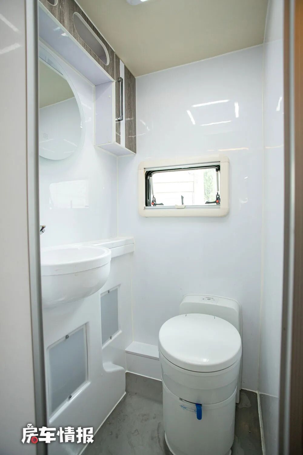 卫浴室内的设计就比较简洁了,提供了马桶、洗手台、储物柜、换气扇和带有LED美颜效果的化妆镜,满足出行的洗漱需求。