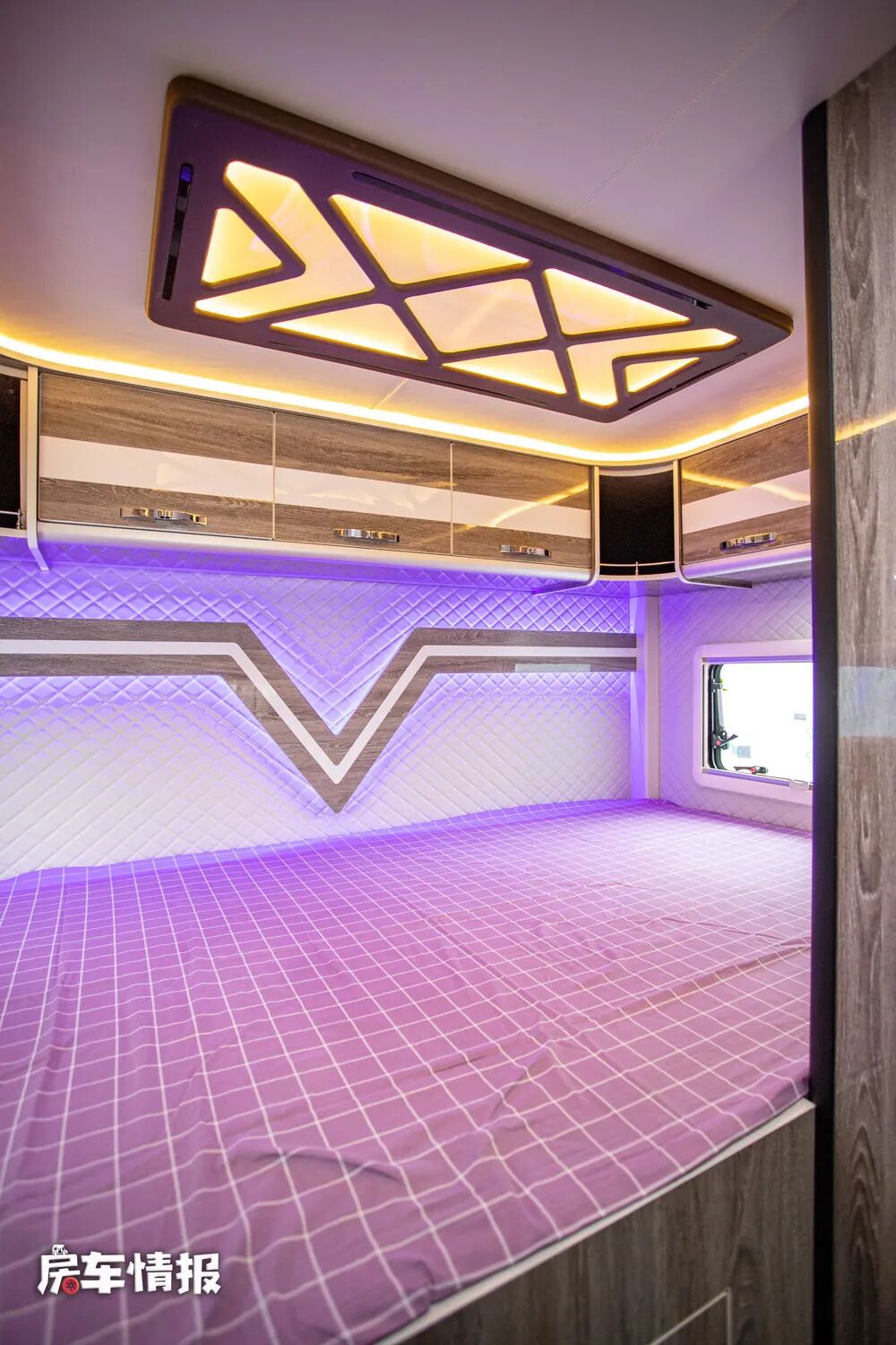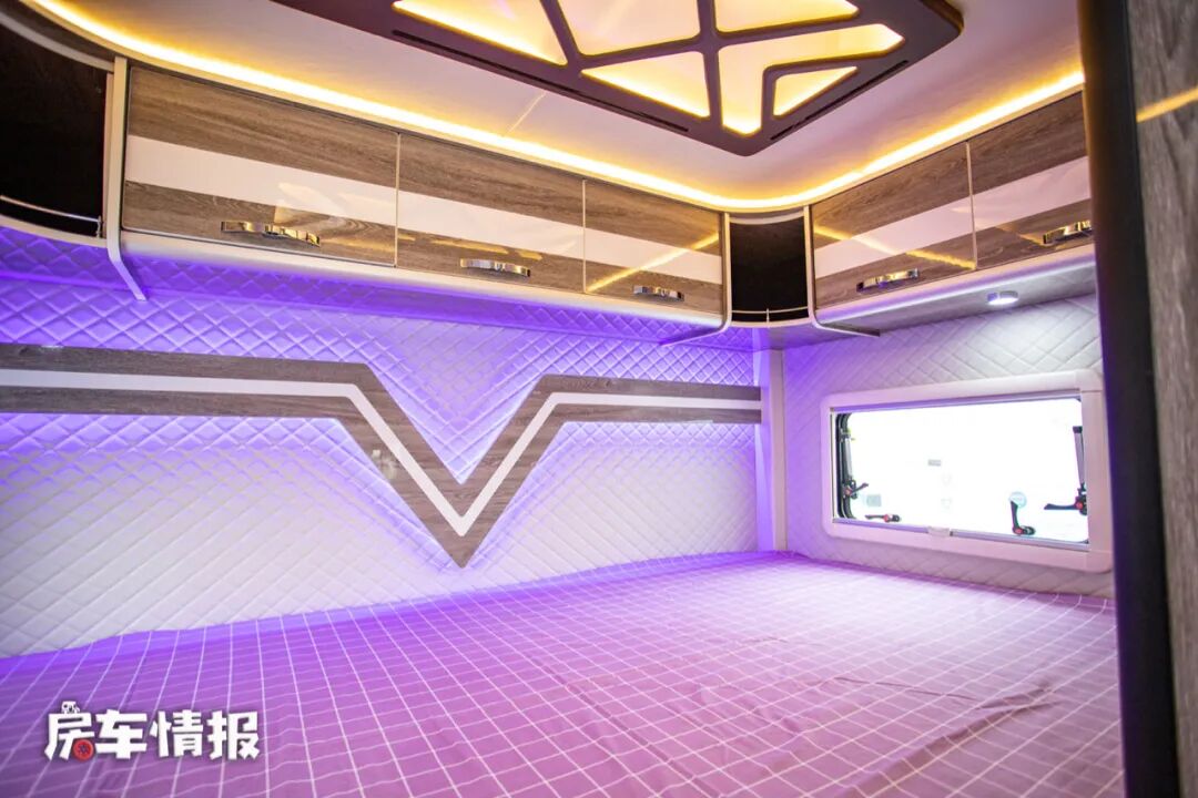 车厢尾部的休息区也加入了紫色的氛围灯设计,并且三面全部采用了软包设计,防止平时磕碰,横置双人床的尺寸为2200mm*1300mm,躺下两个人也没有问题。