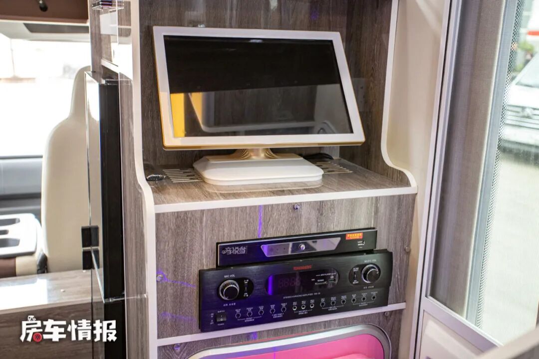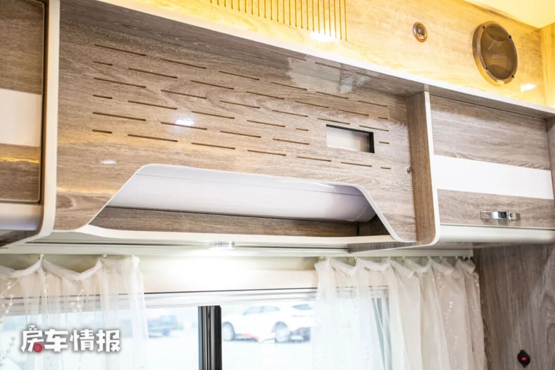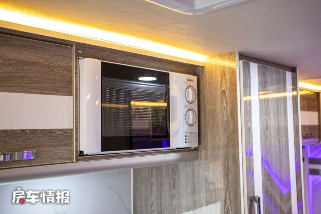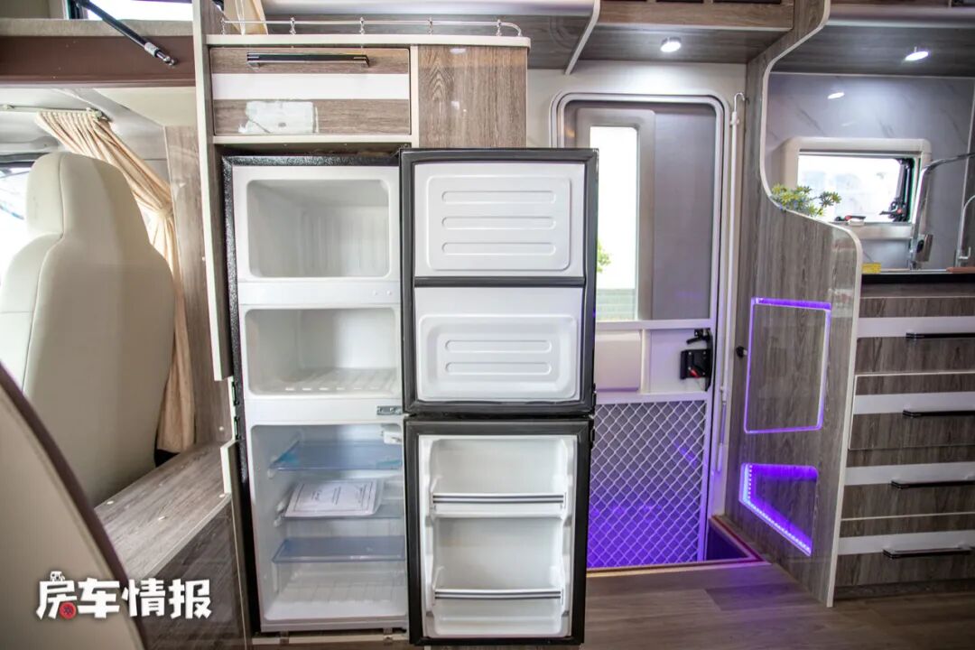 临近乘客门的前方是一台150L上下双开门的冰箱,储存菜饭的空间还是完全足够的,上面的平台平时驻车时也可以外接其他小电器,满足更多的生活需求。