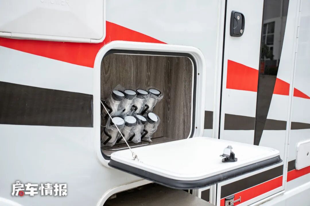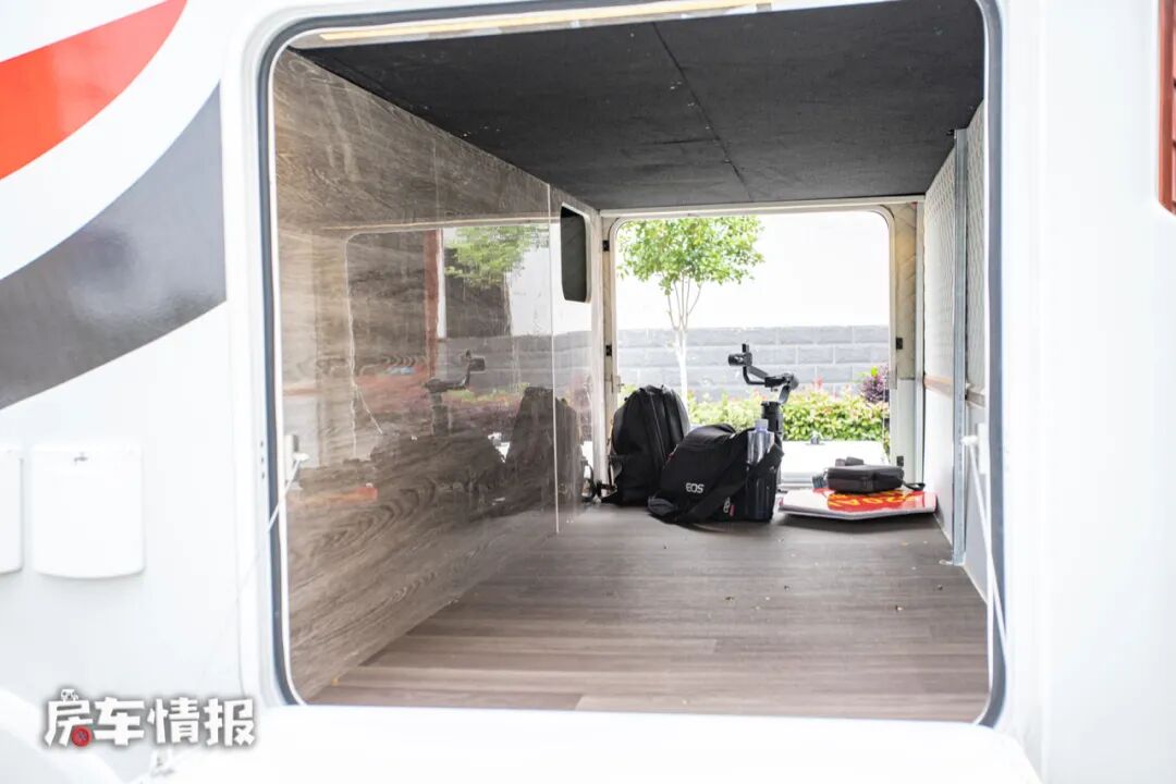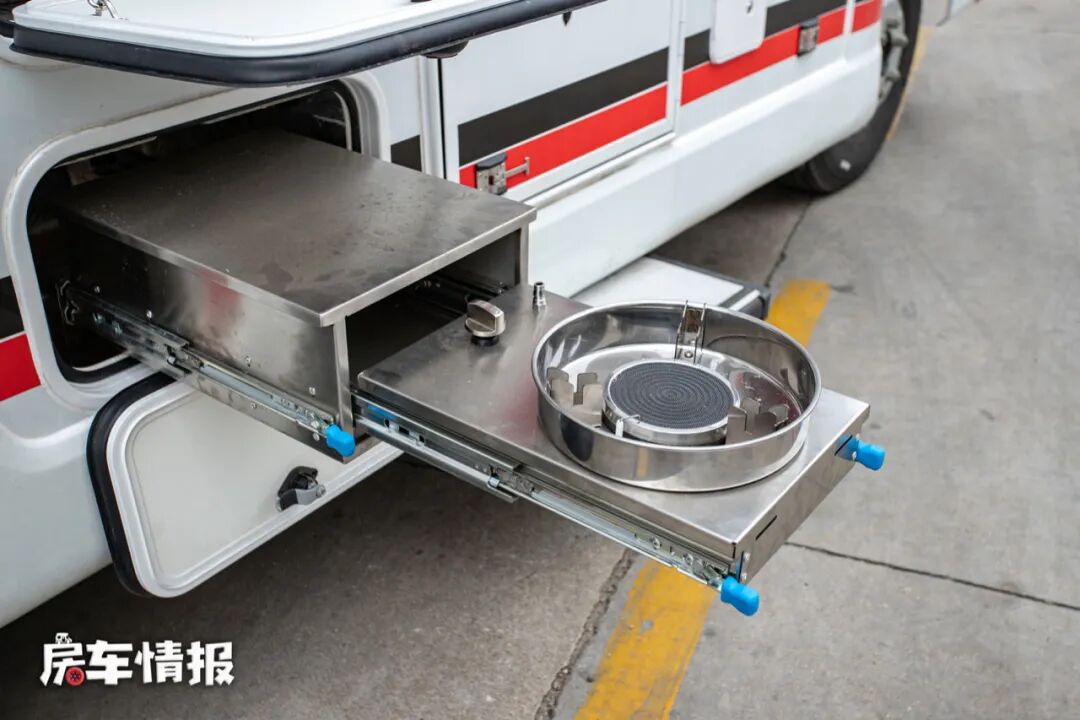 车身外部配置了遮阳棚和外置厨房区,以及车尾部的超大尺寸的贯通式储物舱,另外还提供了基础的水电接驳口。