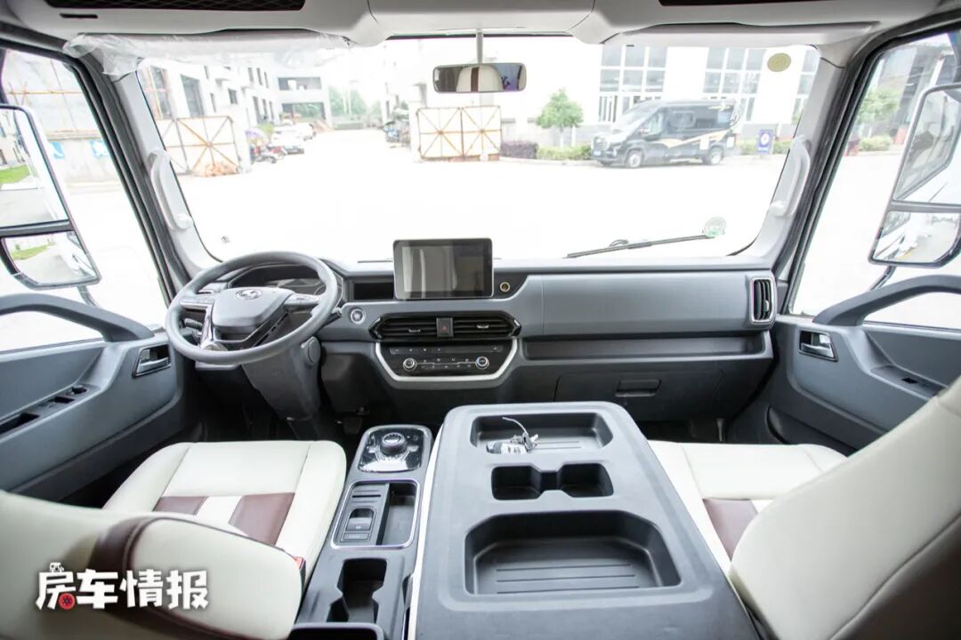 驾驶室内部显然要比普通的C型房车要宽敞,主副驾驶座椅中间还有一个大号的储物箱,同时还配备了多功能方向盘和10寸的彩色触摸屏,这台触摸屏还带有倒车影像及智能语音系统,平时驾驶的时候通过语音就可以控制,更加的安全方便。另外别看是轻卡车型,但采用了和路虎车型相同的旋钮式换挡设计,带有autohold,挺显档次的。