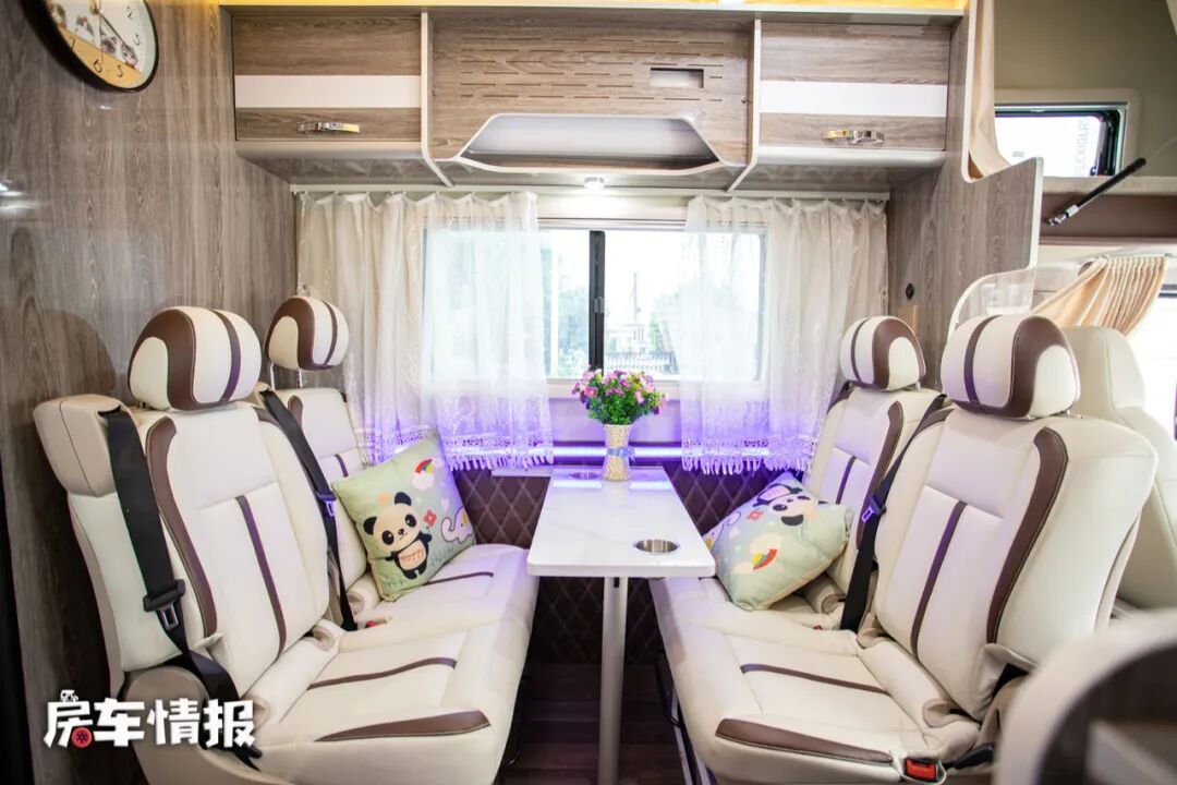 会客区提供了两排对坐沙发座椅,中间提供了一个特别小型的移动餐桌,两排沙发座椅之间的距离不太友好,坐下的时候难免会磕腿,但是座椅的舒适度还是不错的,采用了乘用车座椅的设计,不仅带有头枕,而且靠背可调节,同时还带有四条安全带,所以整车在行驶过程中最多可以核载6人。