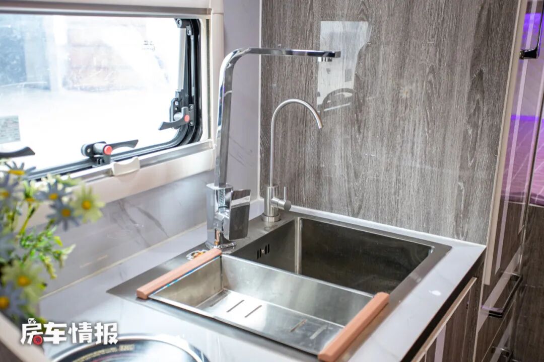 厨房操作台的配置也非常与众不同,因为是双槽的洗菜池+两个水龙头的设计,在其他房车上我们几乎是没有看见过的。