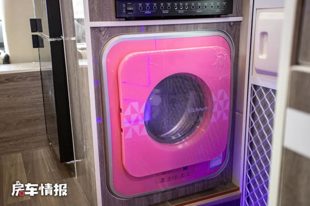 冰箱侧面的区域是全车的设计亮点,下方镶嵌了一台粉色的洗衣机,非常的光彩夺目啊,这位小哥哥是为了自己的女朋友这么设计的吗?真的好有心哈~