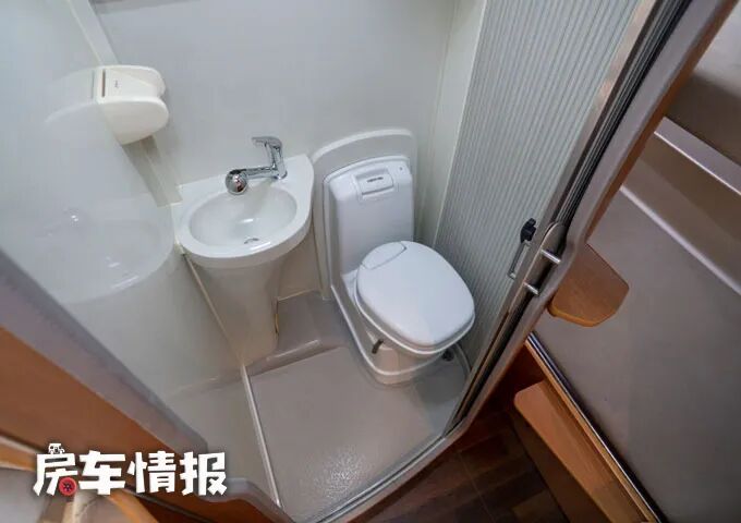 对面是一间独立的卫浴室,这款房车是为数不多的内部提供了完善的洗漱设施的房车,空间上虽然非常的拥挤,但是也提供了马桶、洗手台、淋浴花洒和梳妆镜,基本的洗漱还是可以解决的。