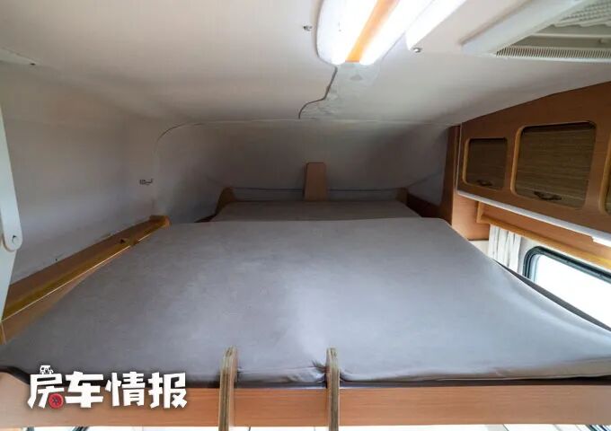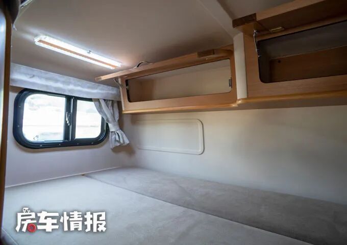 车厢尾部还提供了一张横置的大尺寸双人床,也可以容纳两个成年人睡觉休息使用,床头处带有外推窗,使得休息区的光线不是那么昏暗,上方还提供了储物吊柜,平时也可以存放一些衣服或者被褥。