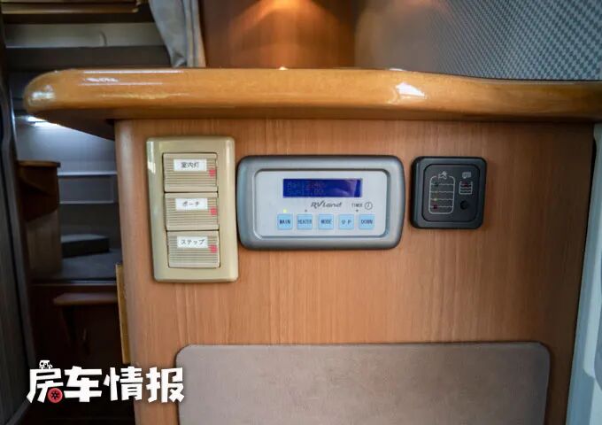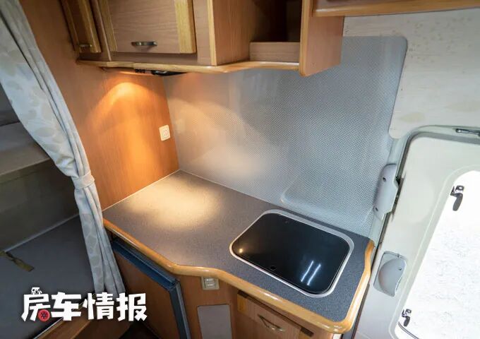 乘客门后方的厨房操作台就表现的中规中矩了,台面上带有一个不锈钢洗菜池,后期也可外接一台便携式的电磁炉,下方是一台65L的冰箱,同时上下都提供了储物空间,方便平时存储物品。