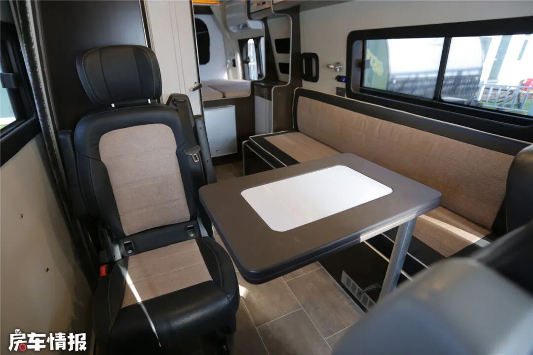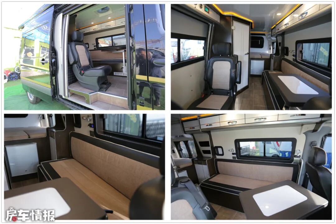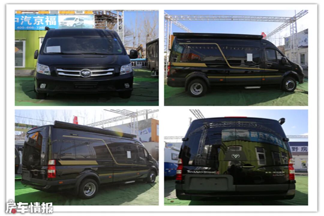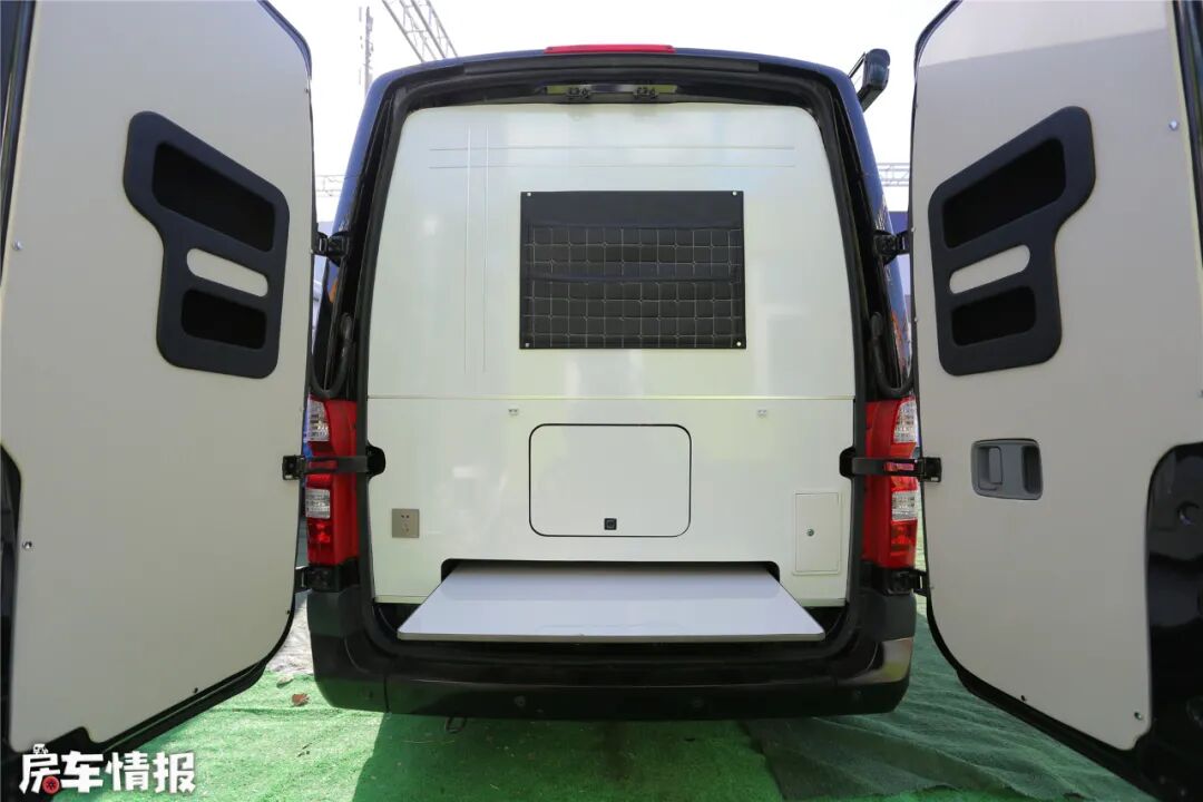 该车车身黝黑,整车都没有复杂的图案和条纹,看上去一脸的商务范。若单从车前看,一般不会认出这是一辆房车,只有仔细绕车勘察之后才发现,车身侧壁和车尾与普通商用车有着明显的不同。